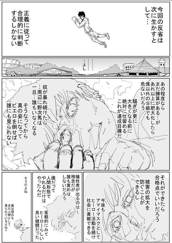 - 読んできたけど自分の中のヒーロー像に葛藤しながら最終的に人前で怪人化を決断する名シーンなのに観覧車の下敷きになるから咄嗟に怪人化しましたみたいになってるやん