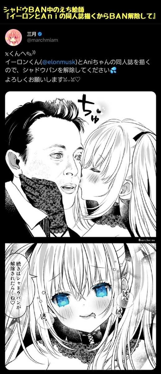 成人向けイラストを投稿しシャドウBANを喰らった絵師さん、イーロンマスクに『Aniちゃんとイーロンの同人誌を描くからBAN解除して』と直談判した後にガチでBAN解除される