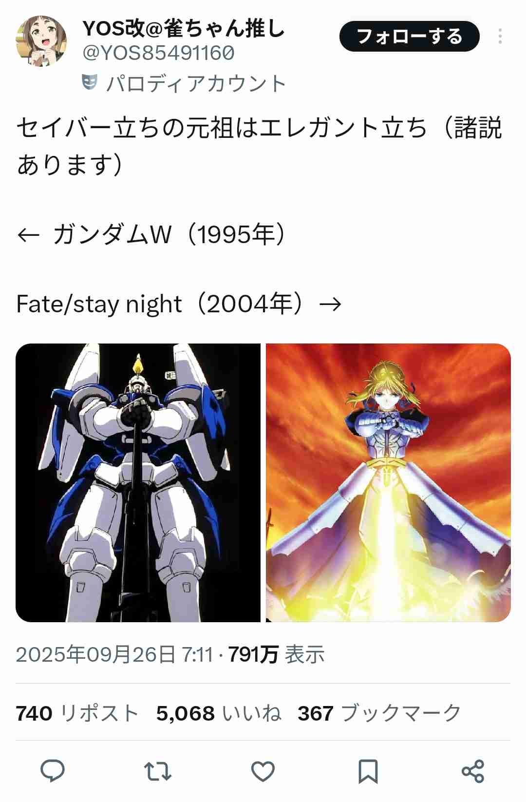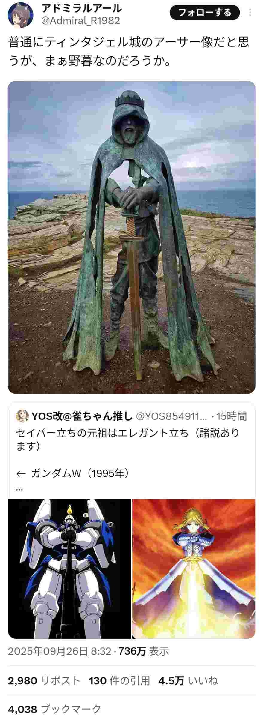 ガノタ「セイバー立ちの源流はガンダム!」 歴史オタク「いやイギリスのアーサー像だけど」→発狂