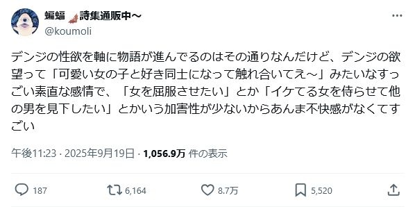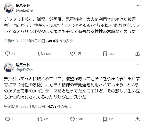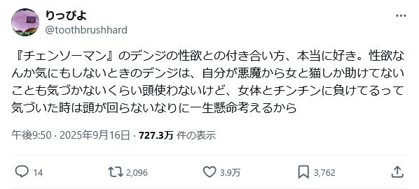 チェンソーって女性ファンも付きやすいジャンプの中じゃ相当男性ファンに寄ってる男ウケ強めの作品なのに