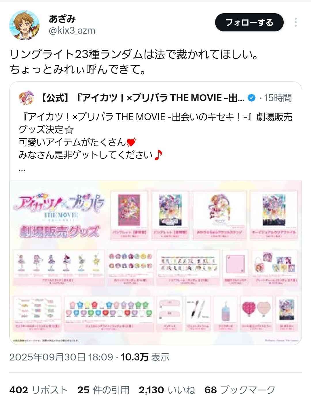 女児向けアニメ映画さん、劇場物販でランダム23種(1個1,100円)のグッズを販売して子供が買えないと炎上中