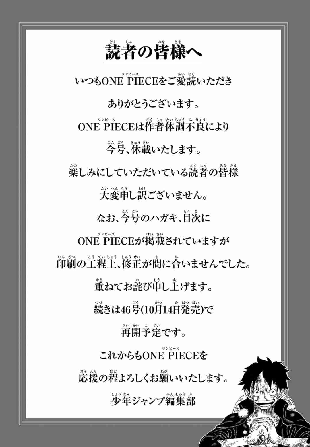 - 休んでくれてもええんやで。ワンピース未完のまま終了は悪夢やしね