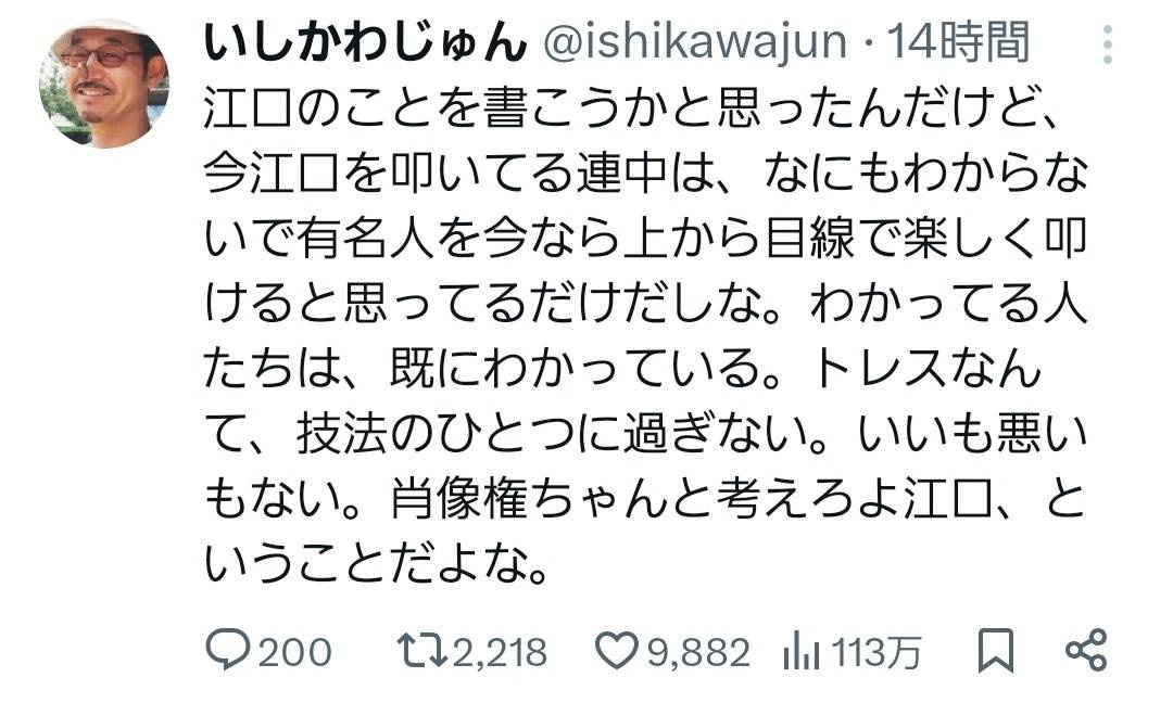 - 何が”肖像権ちゃんと考えろよ江口”だよ