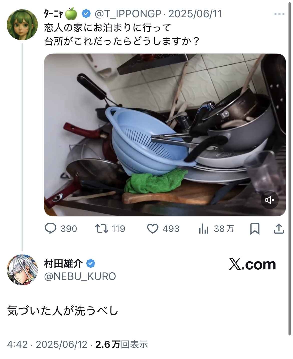 - そもそも恋人の家のこんな散らかった台所勝手に洗うか?