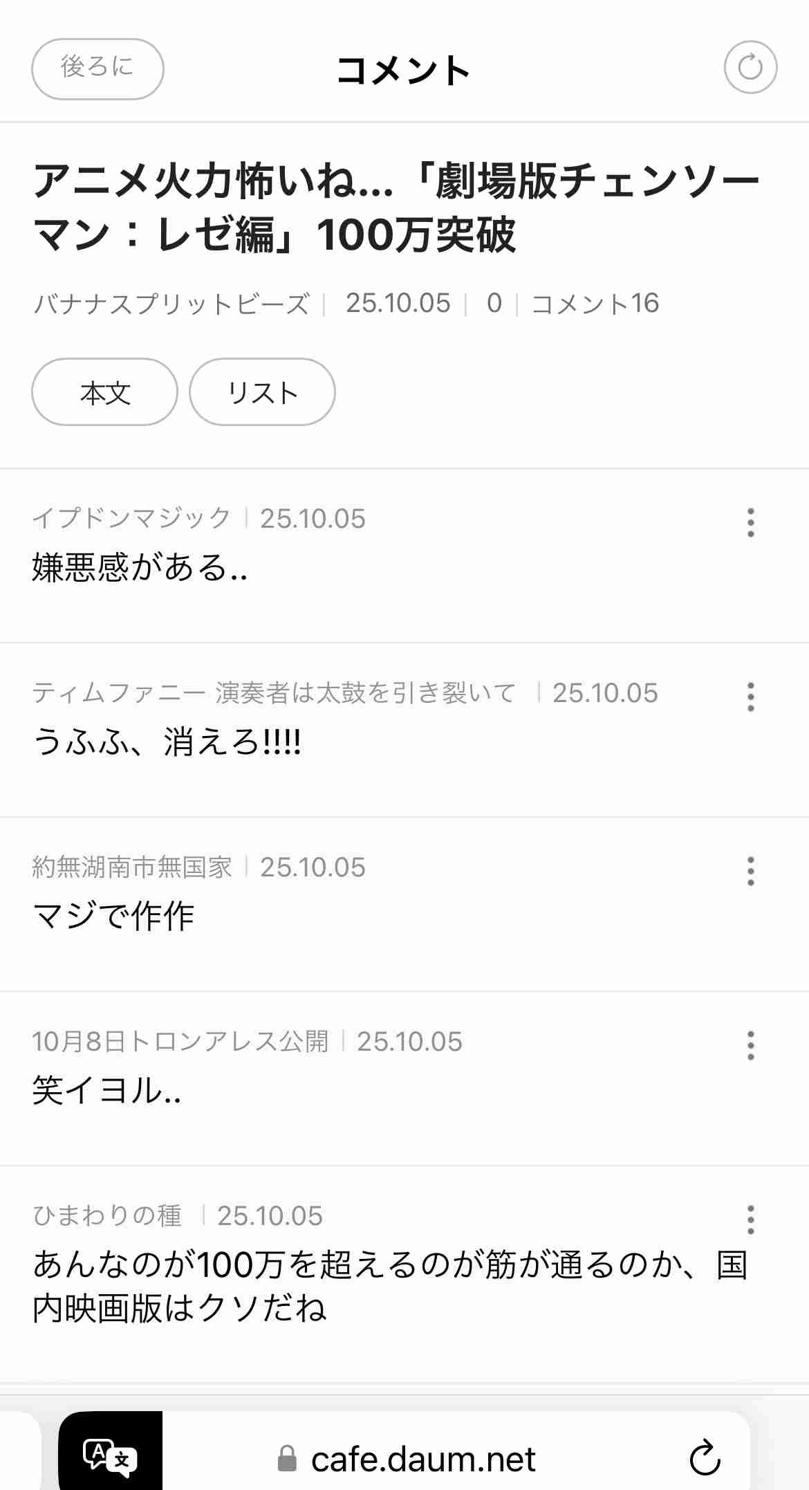 - チェンソーアニメ叩いてる奴ら全員を仲間だと思って一緒になって叩いてたチェンソーアンチがレゼ篇でみんな寝返っちゃって脳破壊されてる構図ほんとすこ