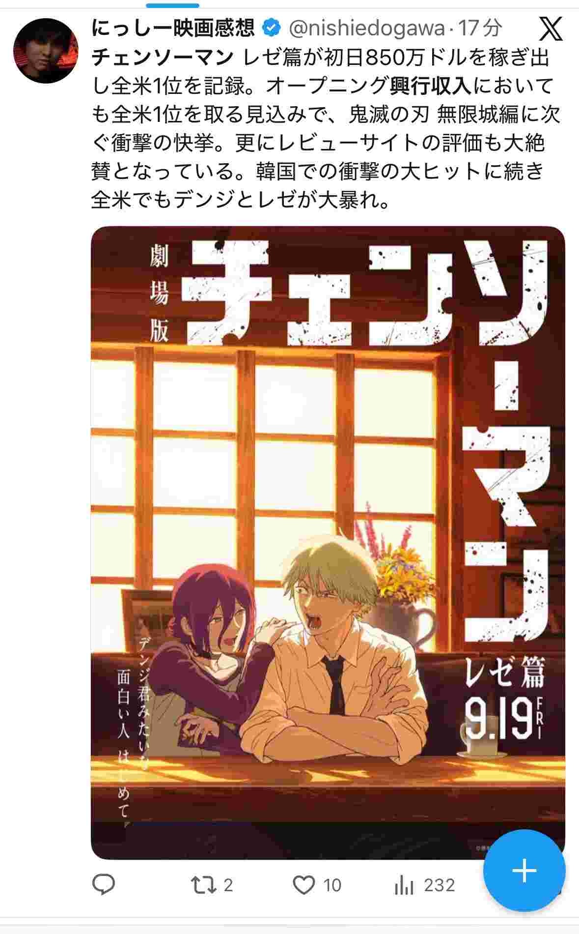 映画チェンソーマン、全米1位を取ってしまうwwweeeeeeewww