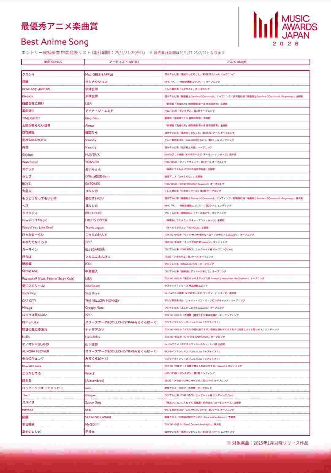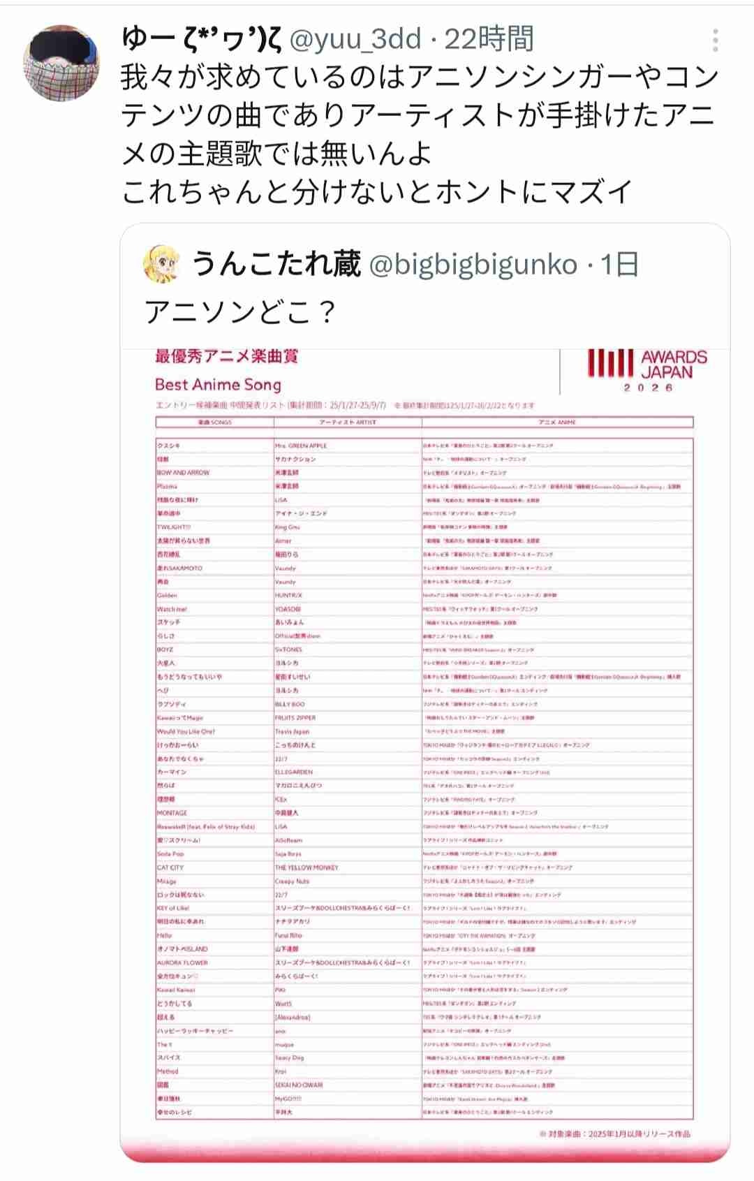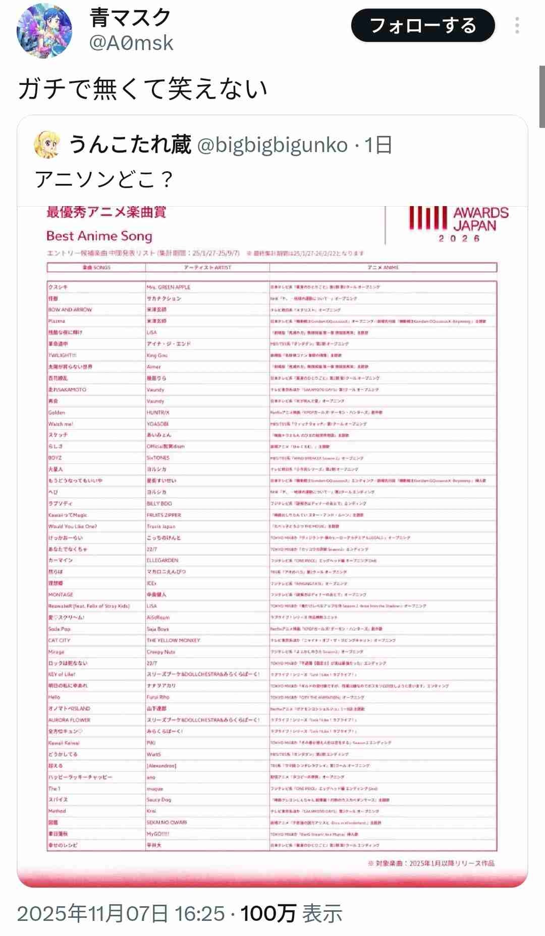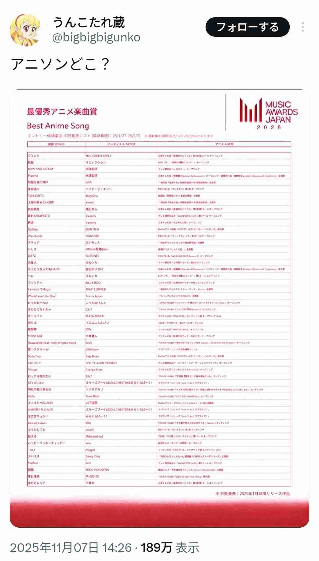 【画像】アニオタ、嘆く「へぇー、これが最優秀アニメ楽曲賞のエントリー候補か。それでアニソンはどこ?」