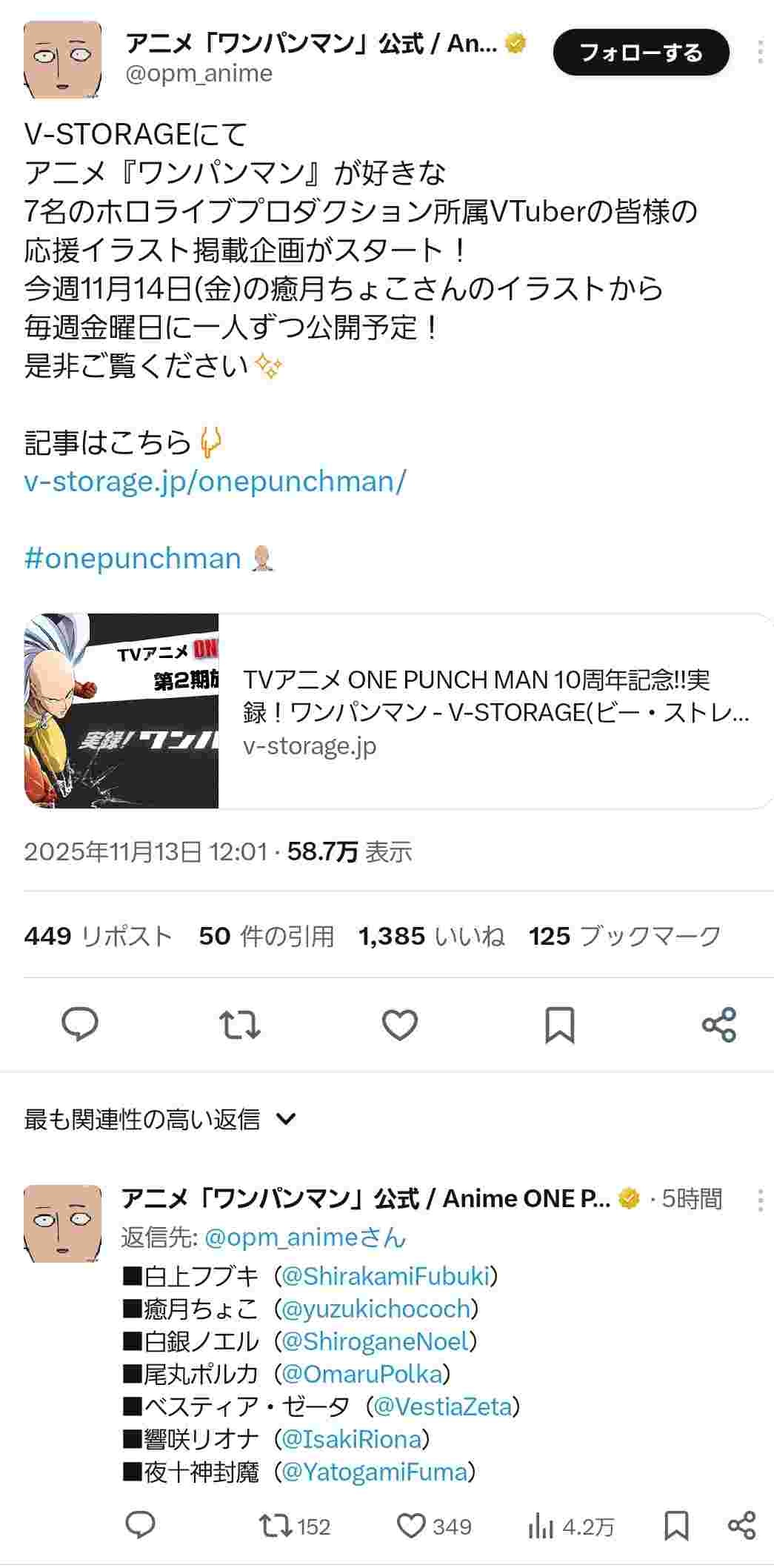 バンダイナムコフィルムワークスが運営するWEBサイト「V-STORAGE(ビー・ストレージ)」にて、アニメ『ワンパンマン』が好きな白上フブキ、白銀ノエルほか7名のホロライブプロダクション所属VTuberの皆様からの応援イラストを公開する企画がスタート! 今週11月14日(金)の癒月ちょこのイラストから毎週金曜日に一人ずつ公開予定です!