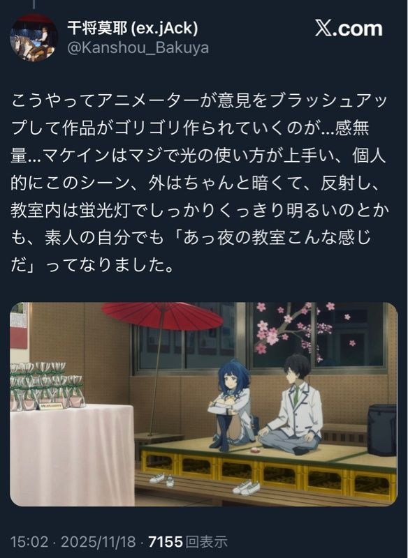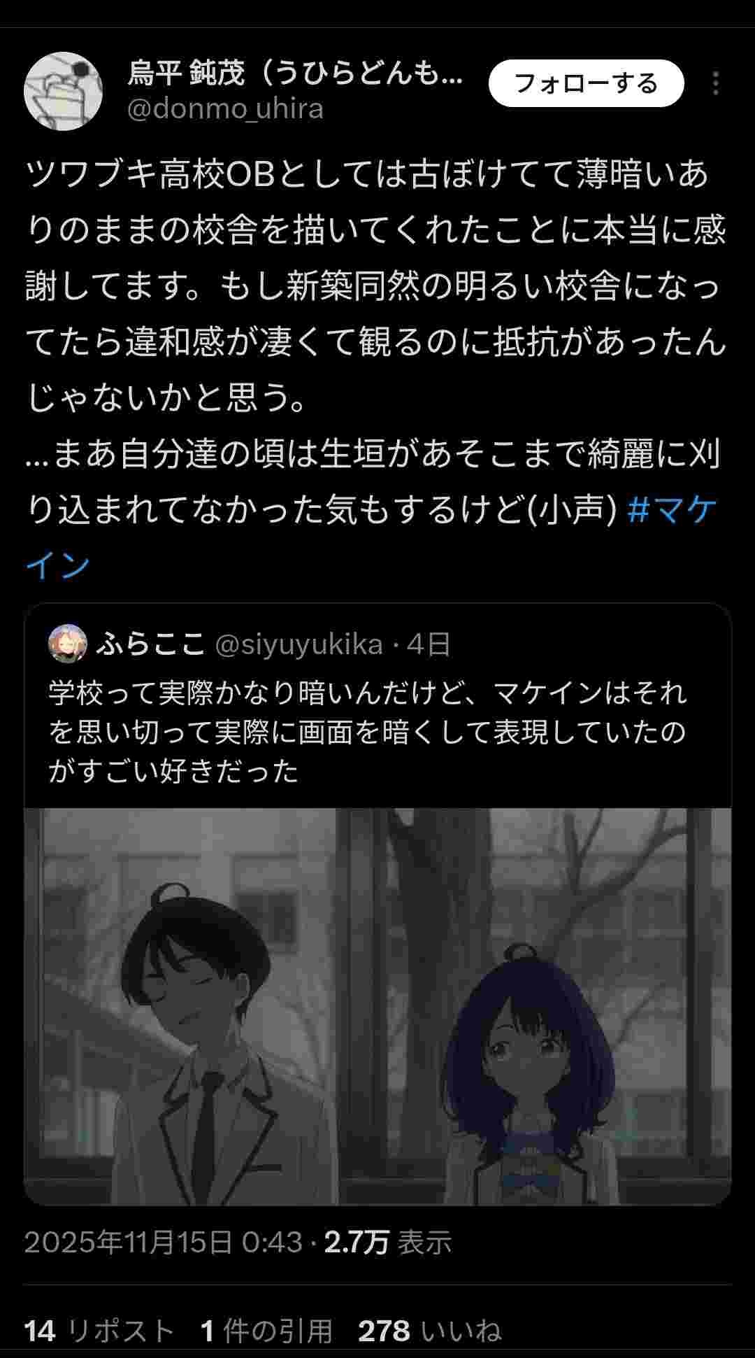 作者はこの高校通ってないらしいしアニメスタッフがチェックしたんかな - 48 : 2025/11/18(火) 19:18:03.985 ID:zvKPkvEdK