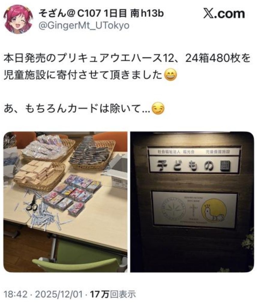 有名漫画家「プリキュアウエハース24ボックス480枚を児童施設に寄付しました!あ、オマケのカードは抜いてますよ(笑)」