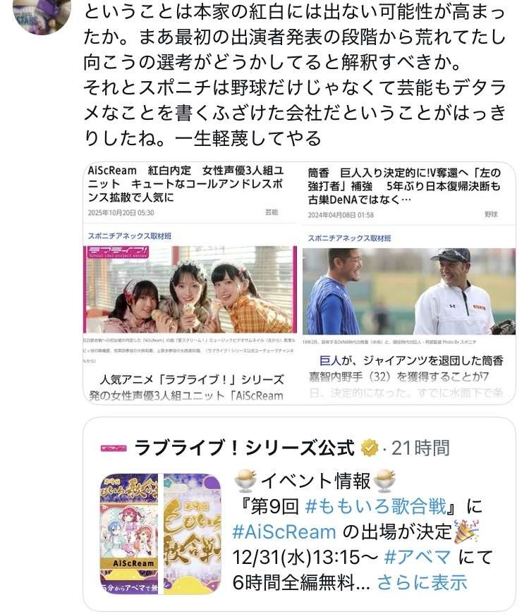 誤報道のスポニチにキレるラブライバーたち