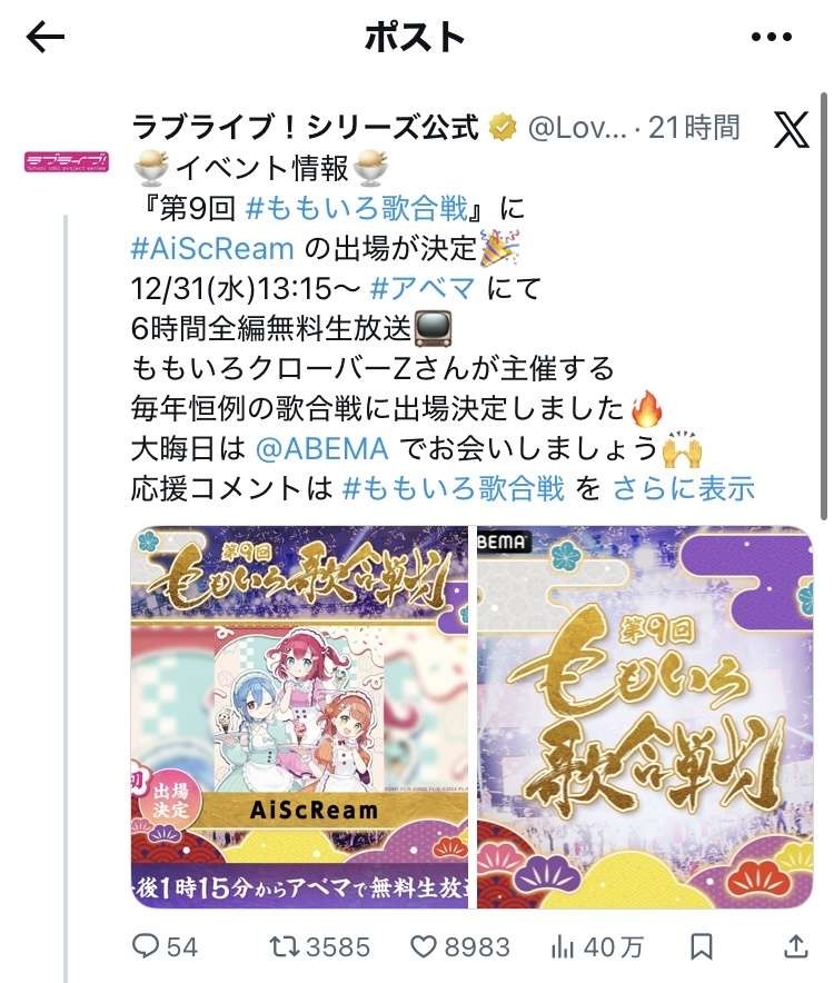 ちな12/31別イベント参加のため紅白落選も確定した模様