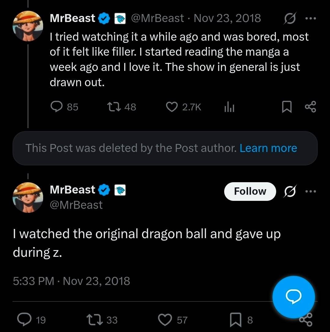 Youtubeの王MrBeast「ドラゴンボール?退屈だったわwww」