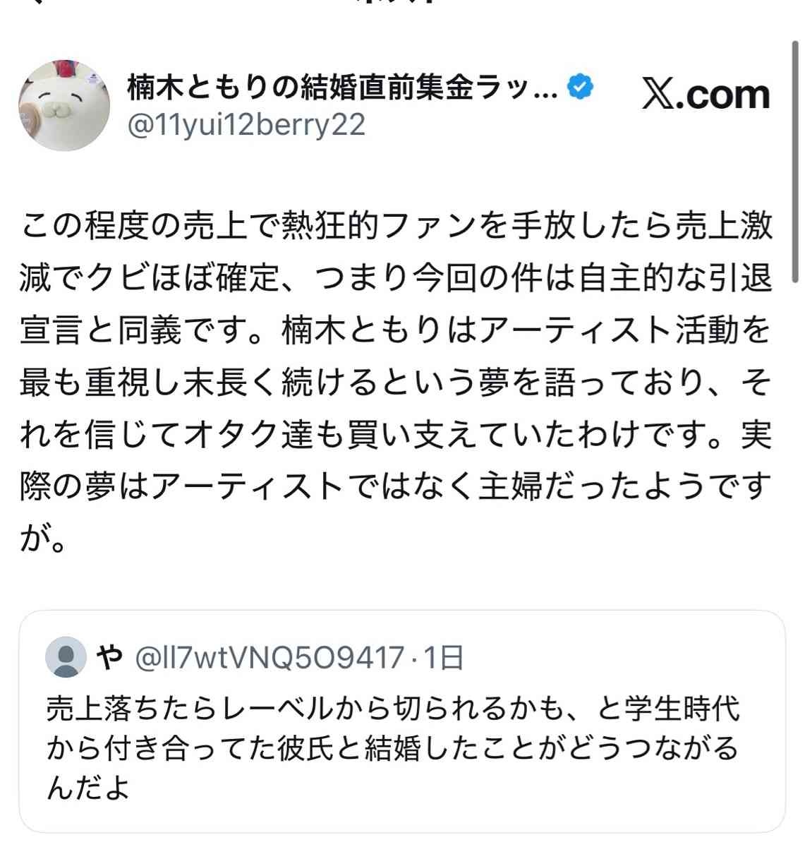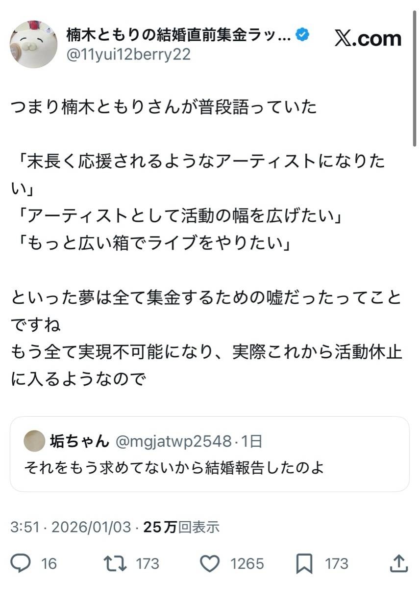 ただ楠木ともりはずっとアーティスト活動を長く続けることを最大の目標と掲げてたのにそれを裏切ったから怒ってるという現状らしい - 27 : 2026/01/04(日) 07:34:01.127 ID:iZ0wWNwYr