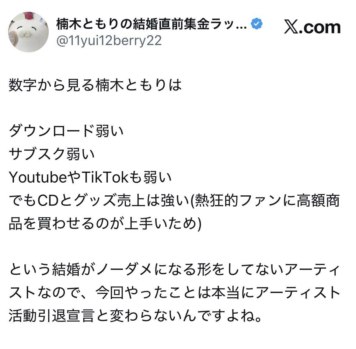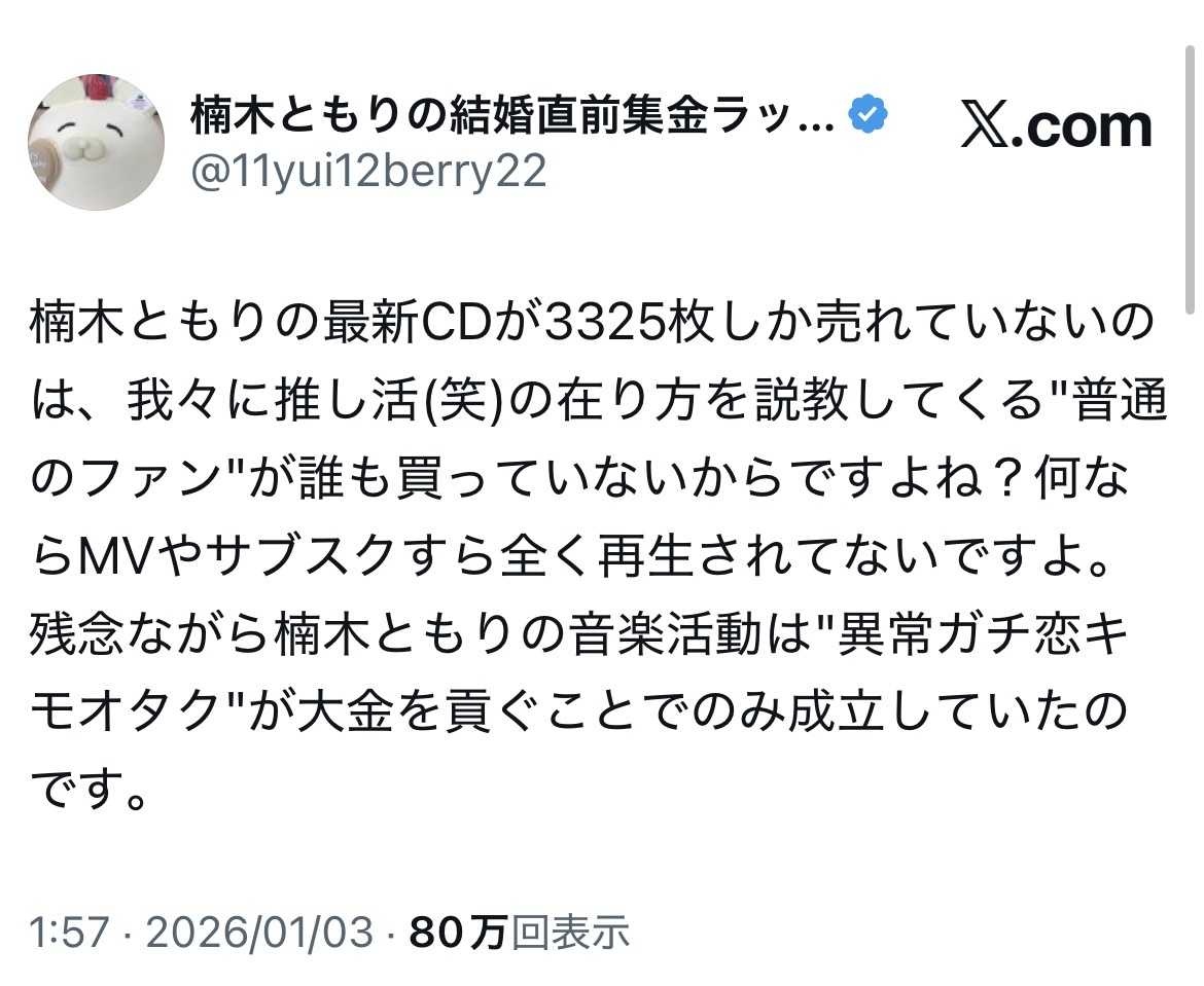 楠木ともりの最新CDが3325枚しか売れていないのは、我々に推し活(笑)の在り方を説教してくる”普通のファン”が誰も買っていないからですよね?何ならMVやサブスクすら全く再生されてないですよ。残念ながら楠木ともりの音楽活動は”異常ガチ恋キモオタク”が大金を貢ぐことでのみ成立していたのです。