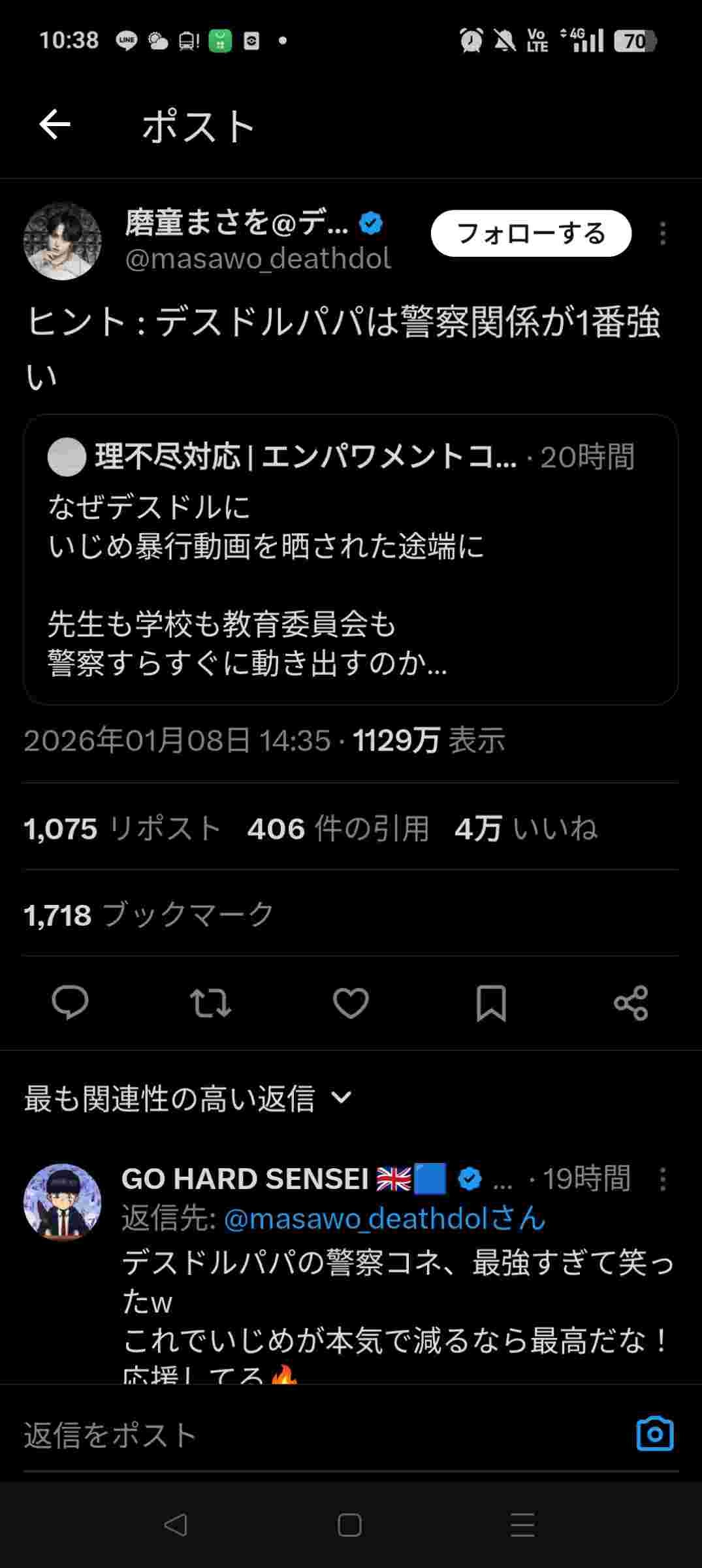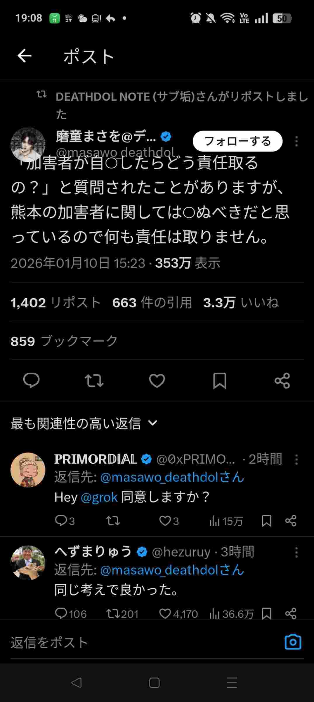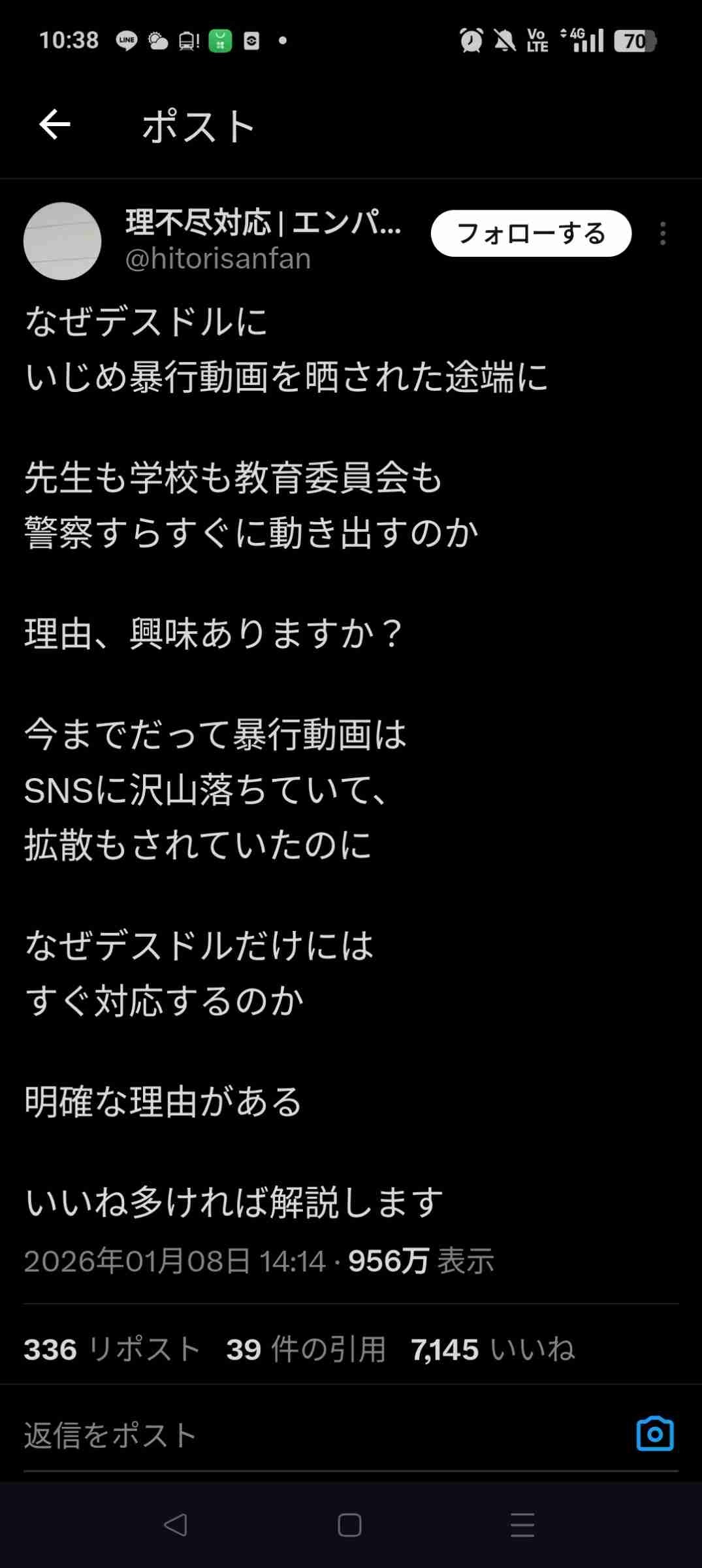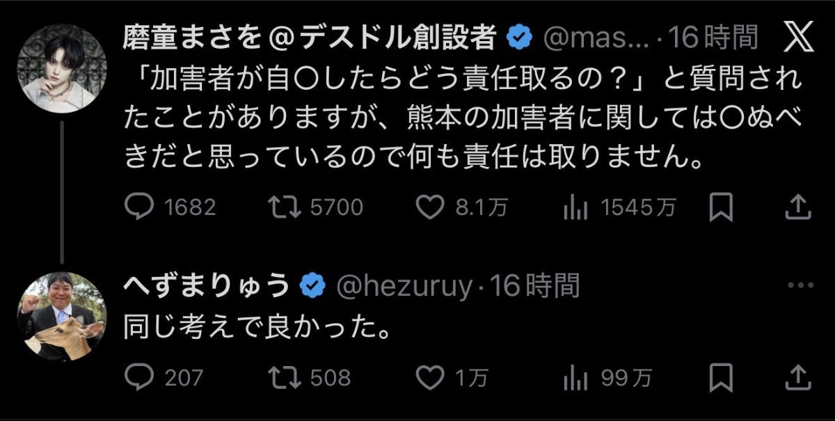 - デスドル「俺の自民党議のパパは警察とのコネクションがあるから言うこと聞く。ちなみに俺は加害者晒ししてるけど加害者はジサツするべきだと思う」
