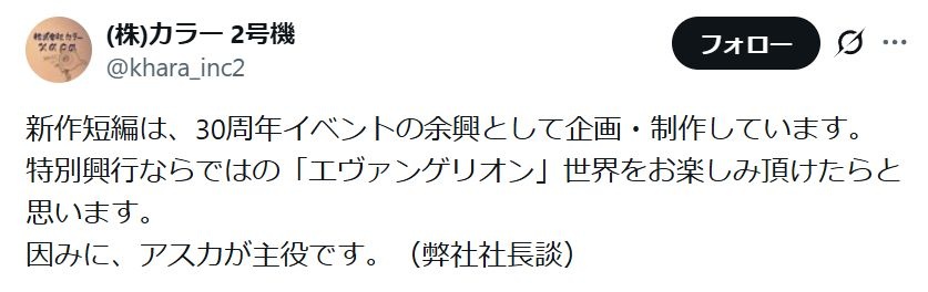 本作について「因みに、アスカが主役です。(弊社社長談)」と投稿。社長である庵野秀明さんの発言として、ファンに向けた情報を明かした形だ。