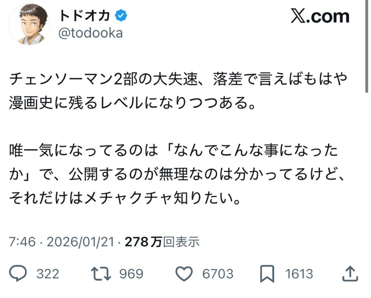 有識者「チェンソーマンの2部は歴史に残る大失速、大失敗続編」←これw w w w w w w