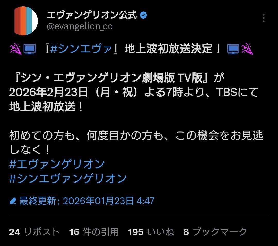 - シンエヴァ地上波放送ってまぁまぁなニュースバリューありそうやけど、スレ伸び無さ過ぎやろ