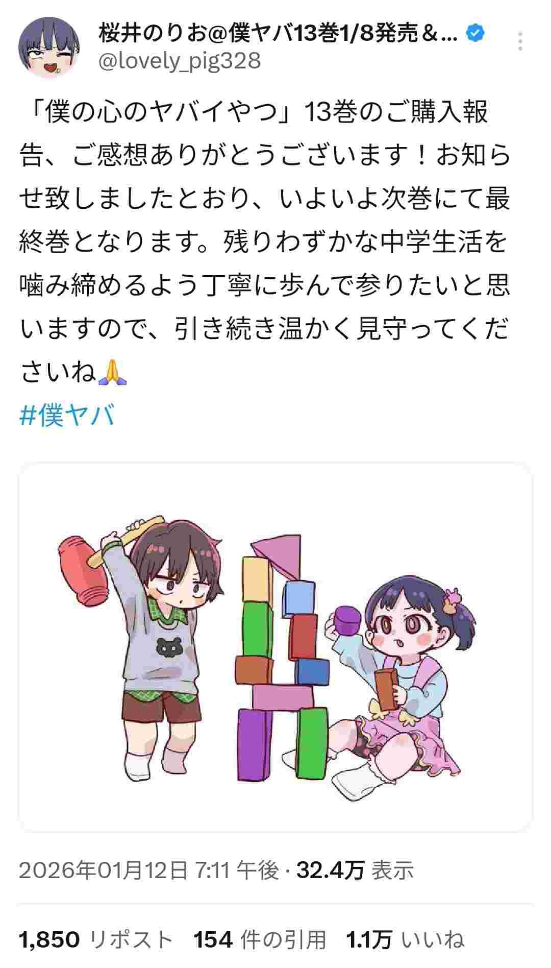 【画像】漫画「僕の心のヤバイやつ」次巻で最終巻、ついにセクロス解禁