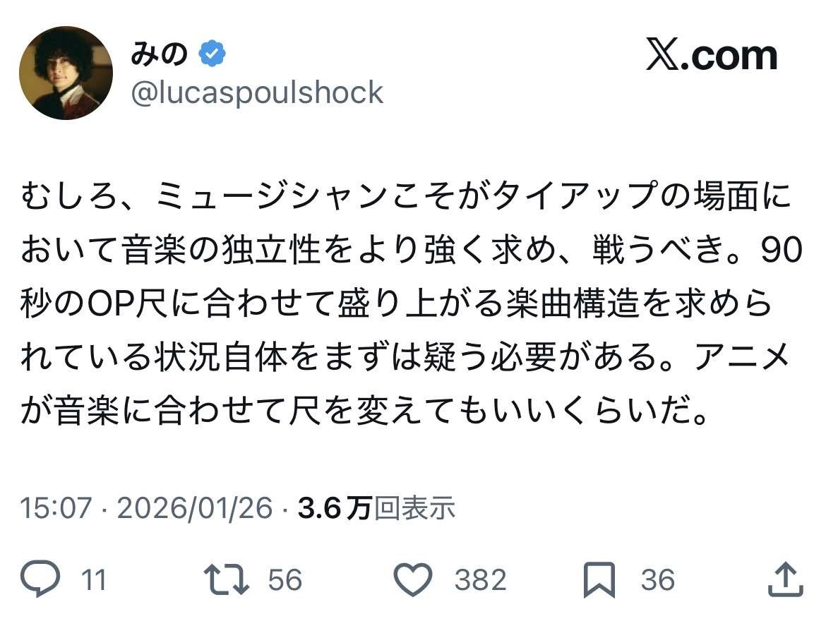 みのミュージック「アニメがアーティストに合わせてOPの尺を変えるべき」