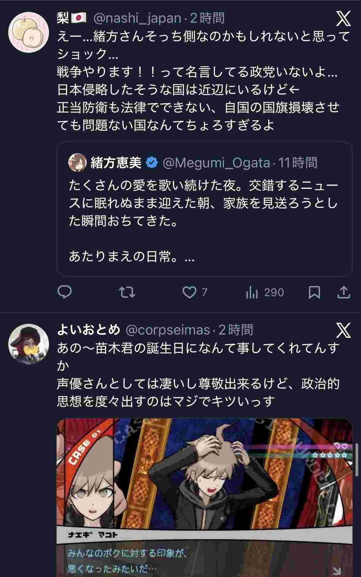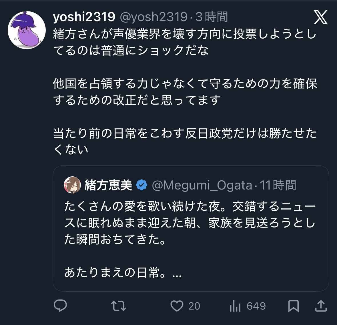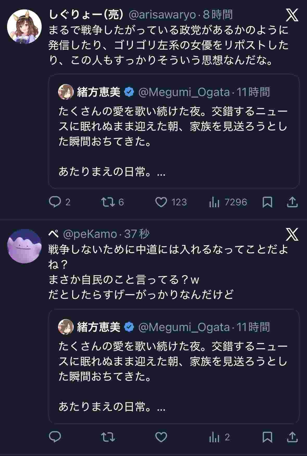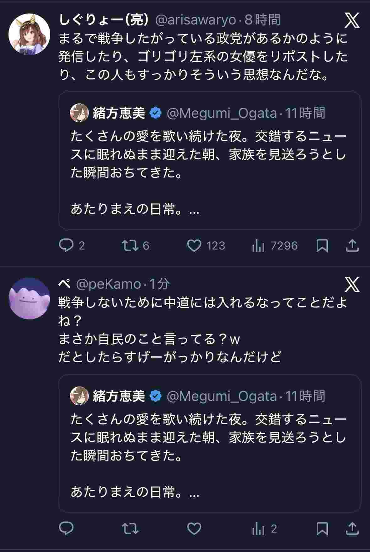- 緒方恵美って割と右よりやった気がするんやけど高市NGなんか