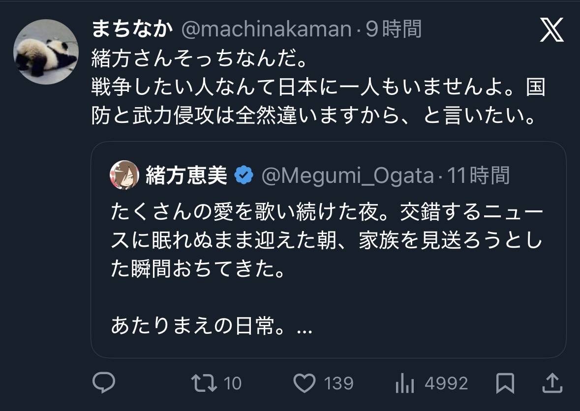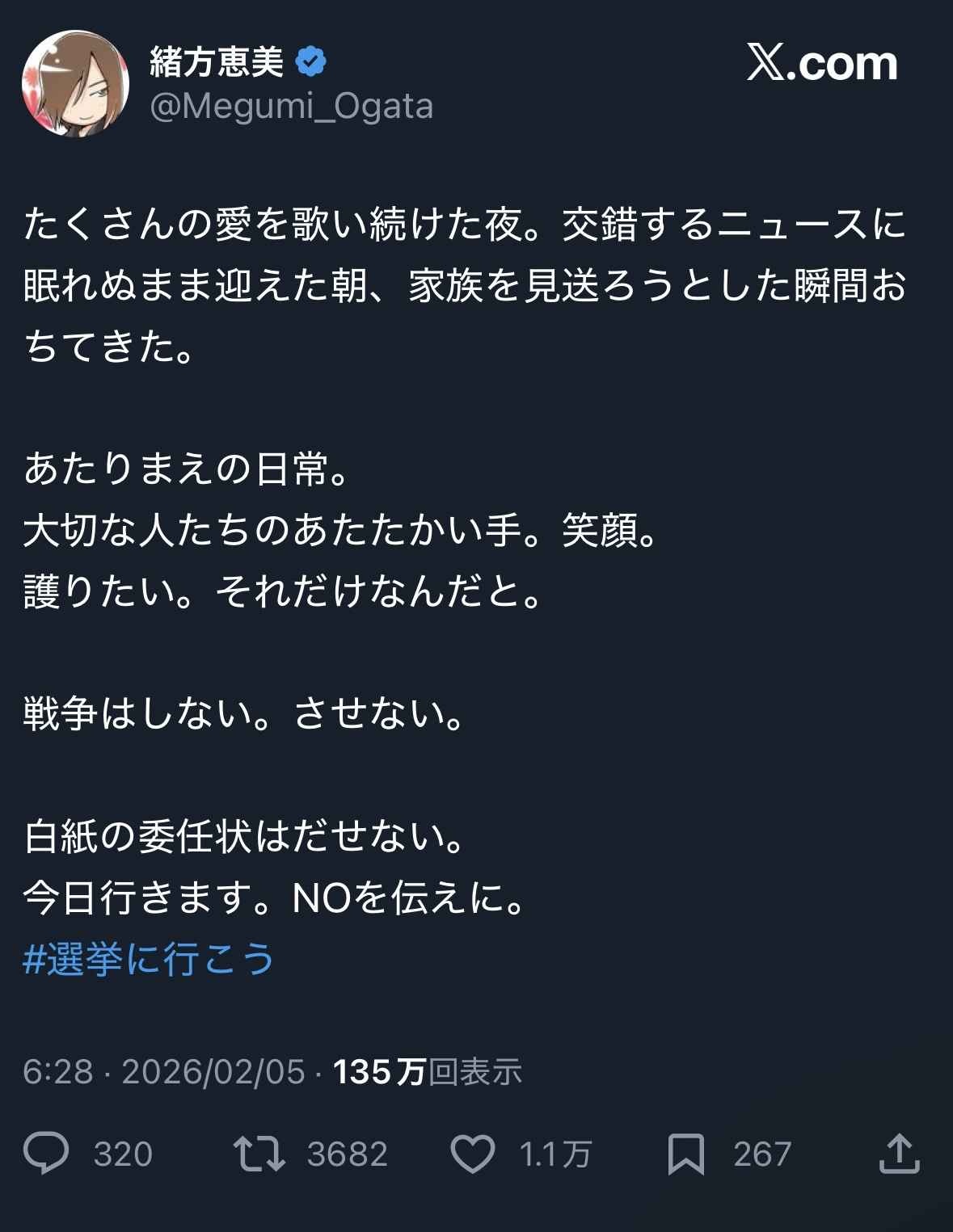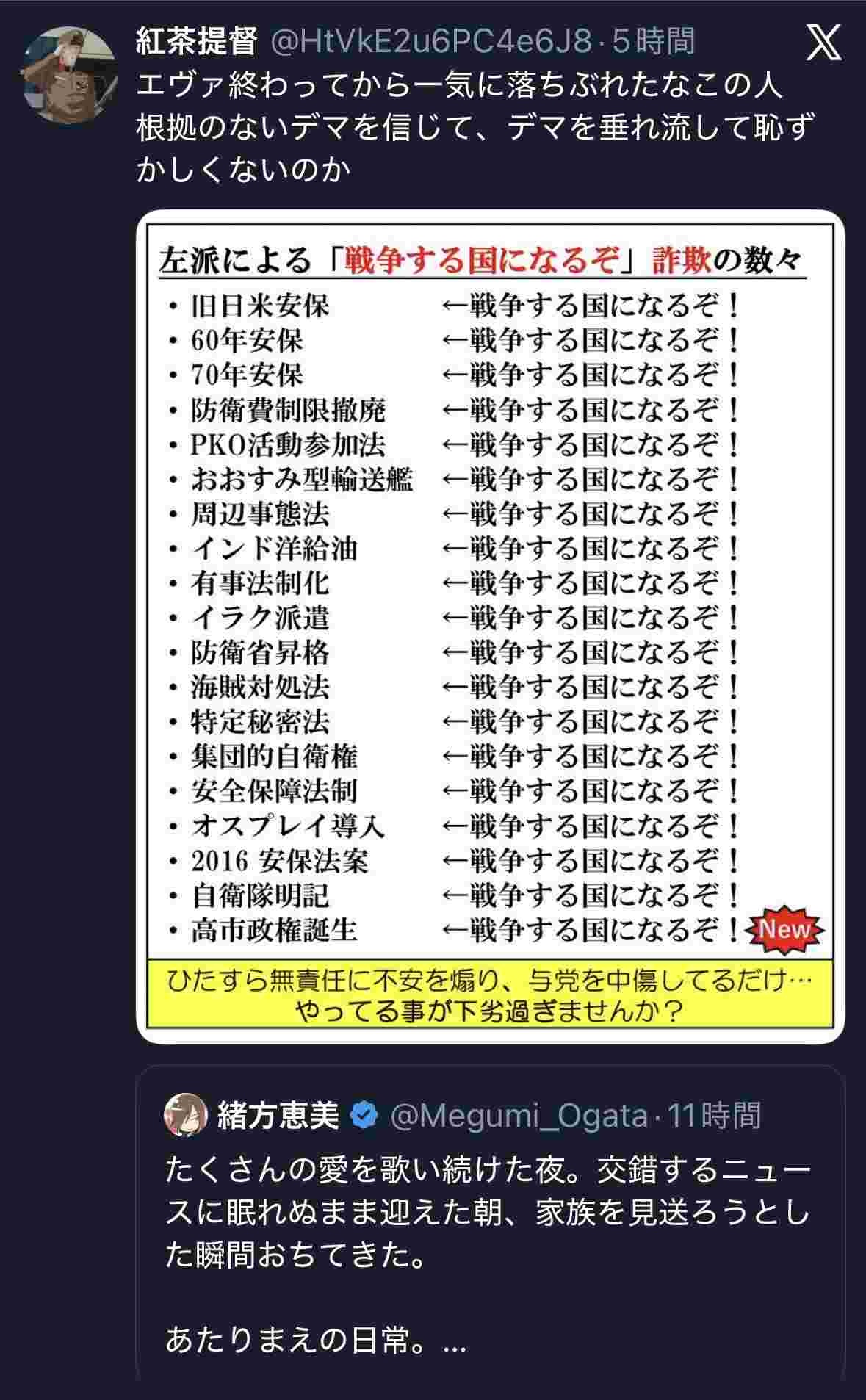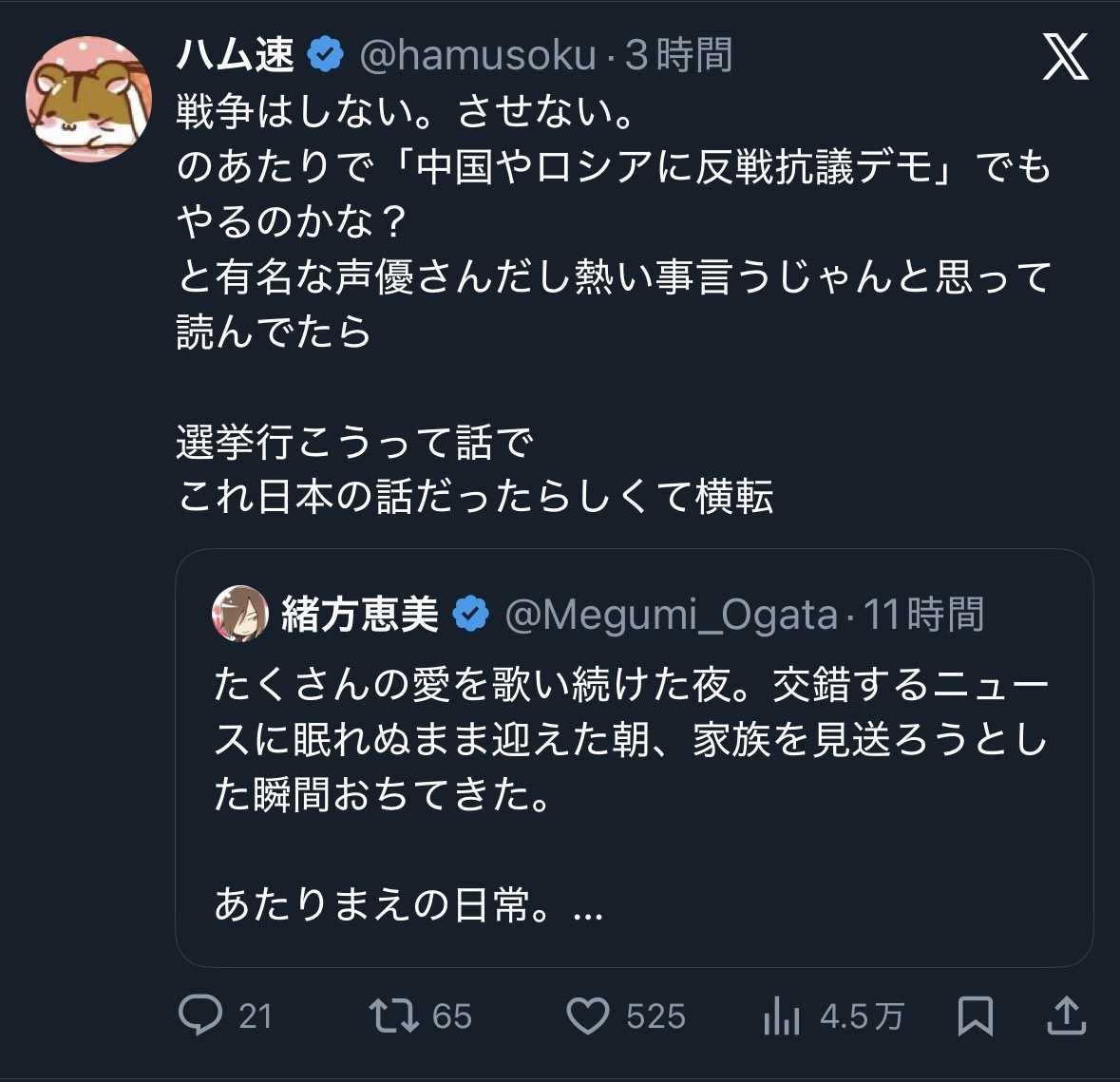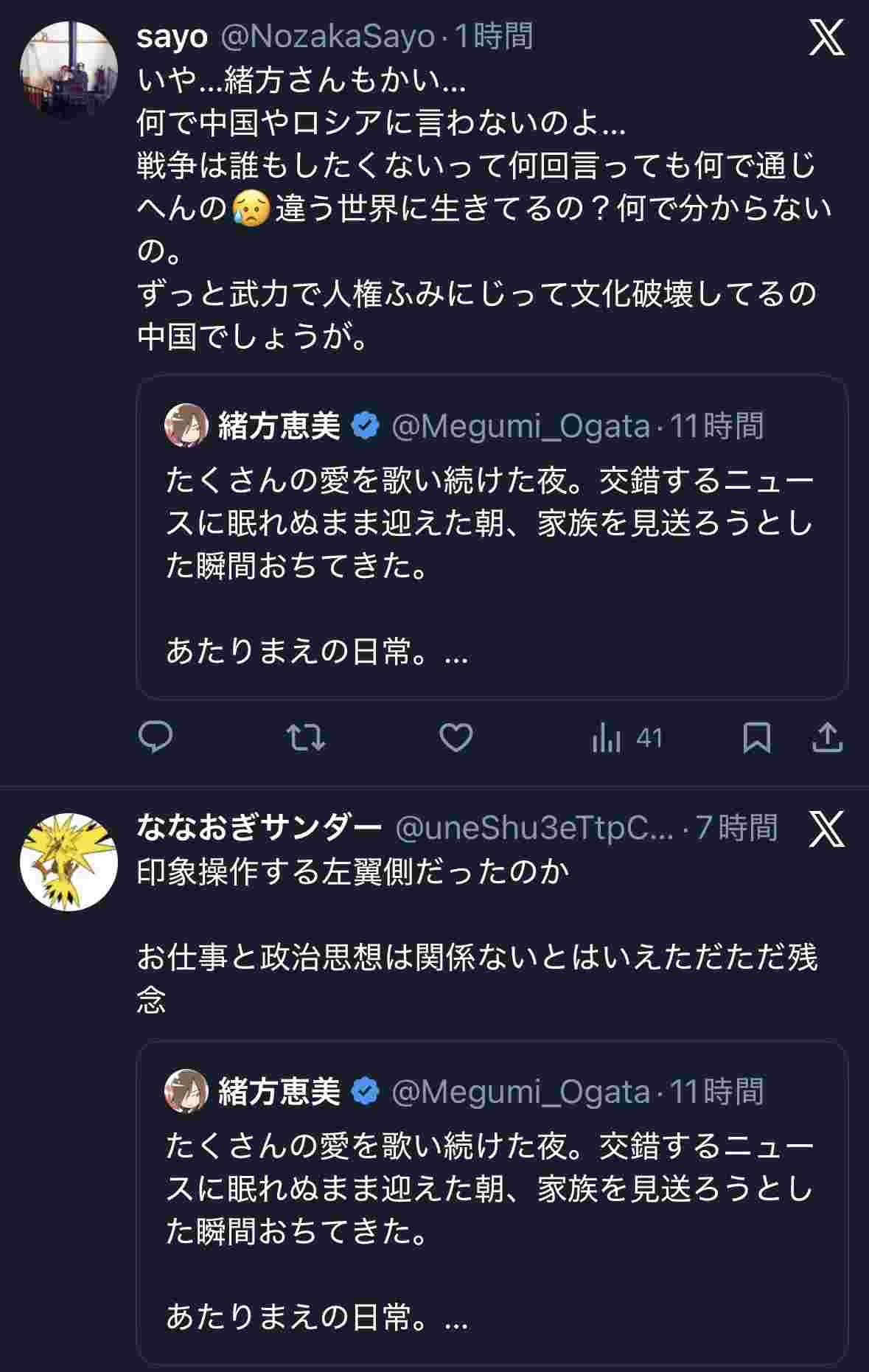 - 緒方恵美って割と右よりやった気がするんやけど高市NGなんか
