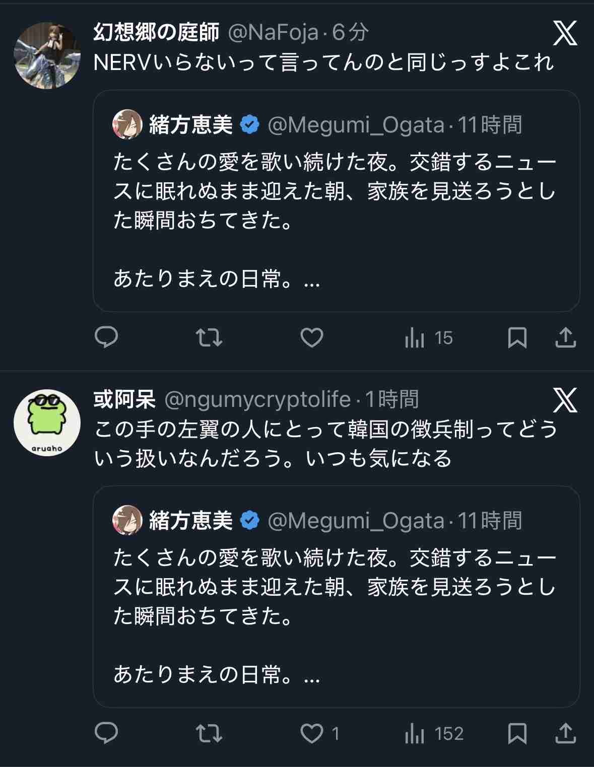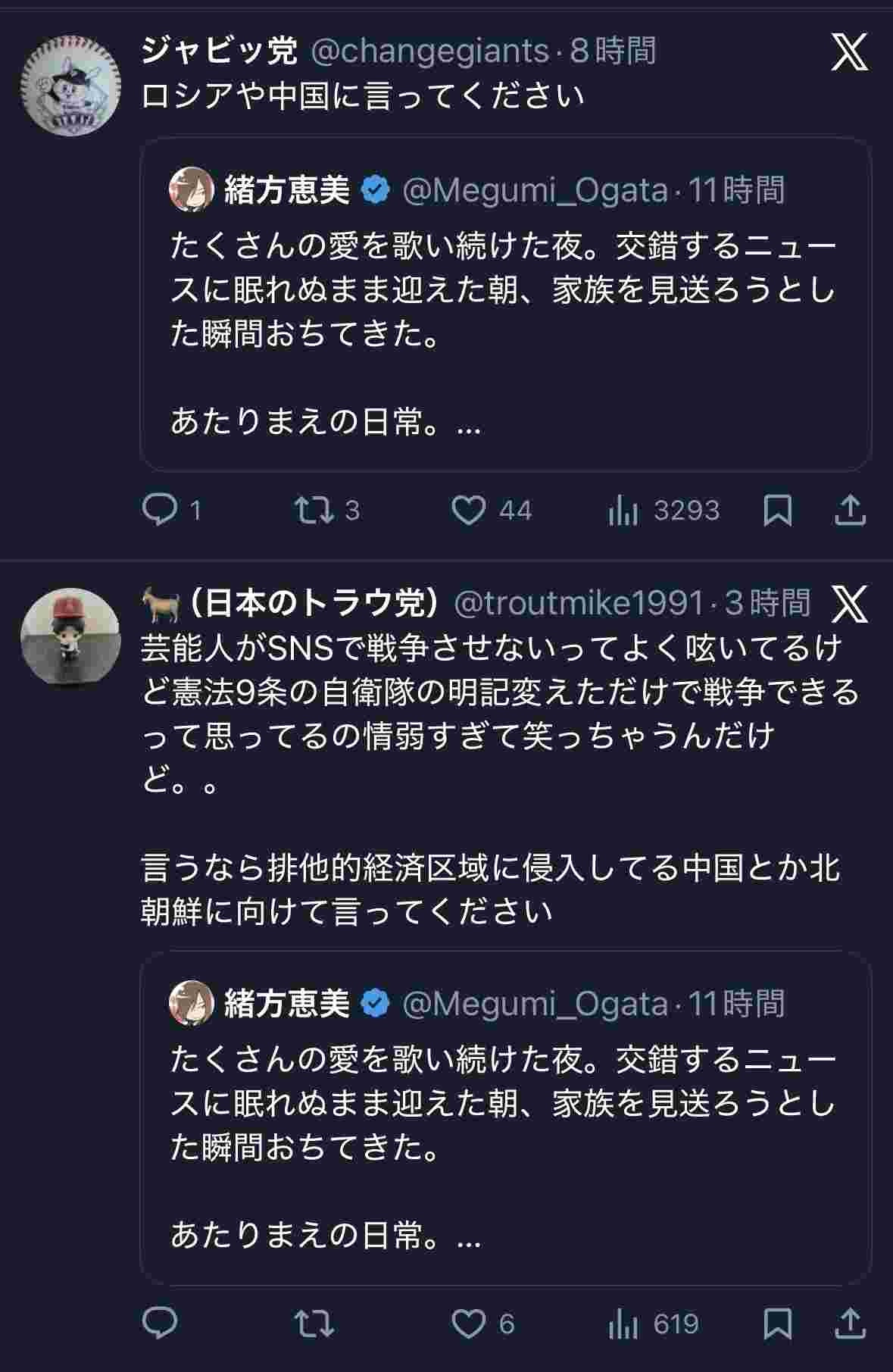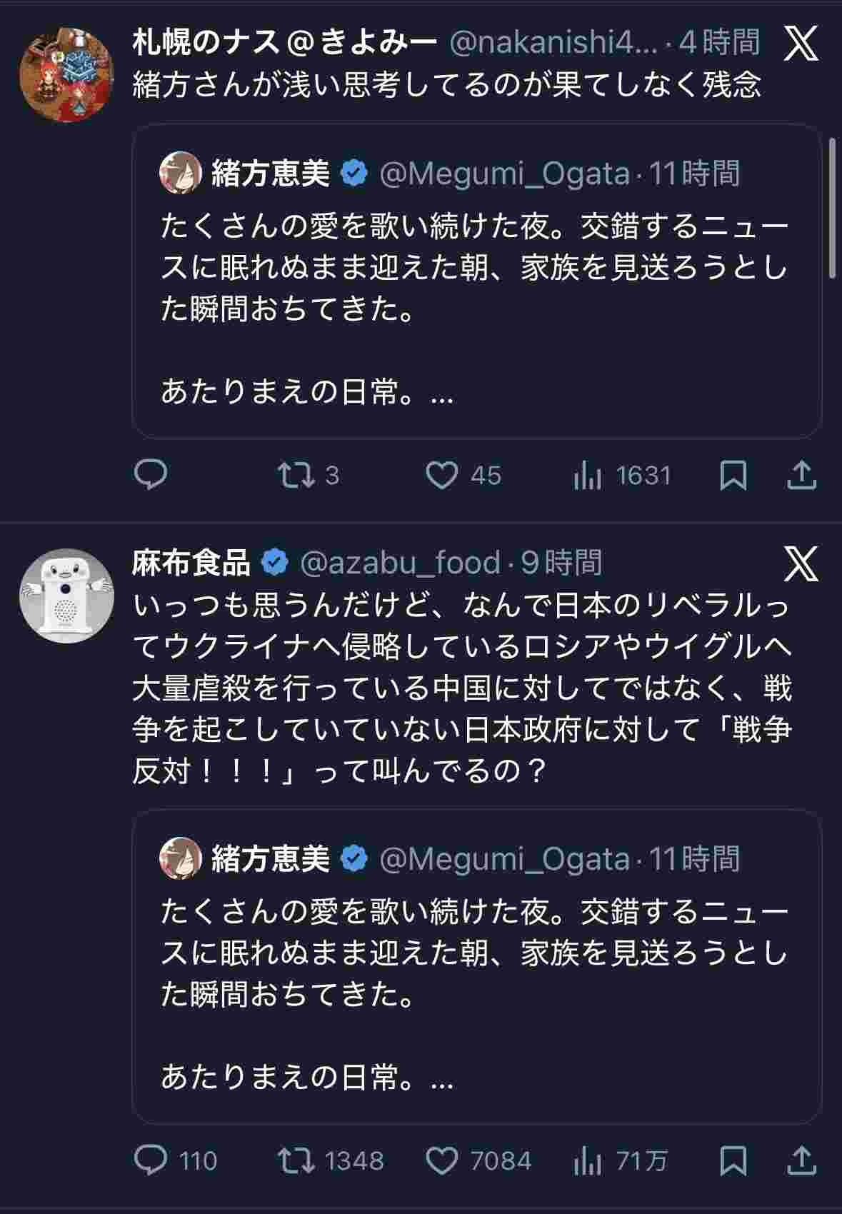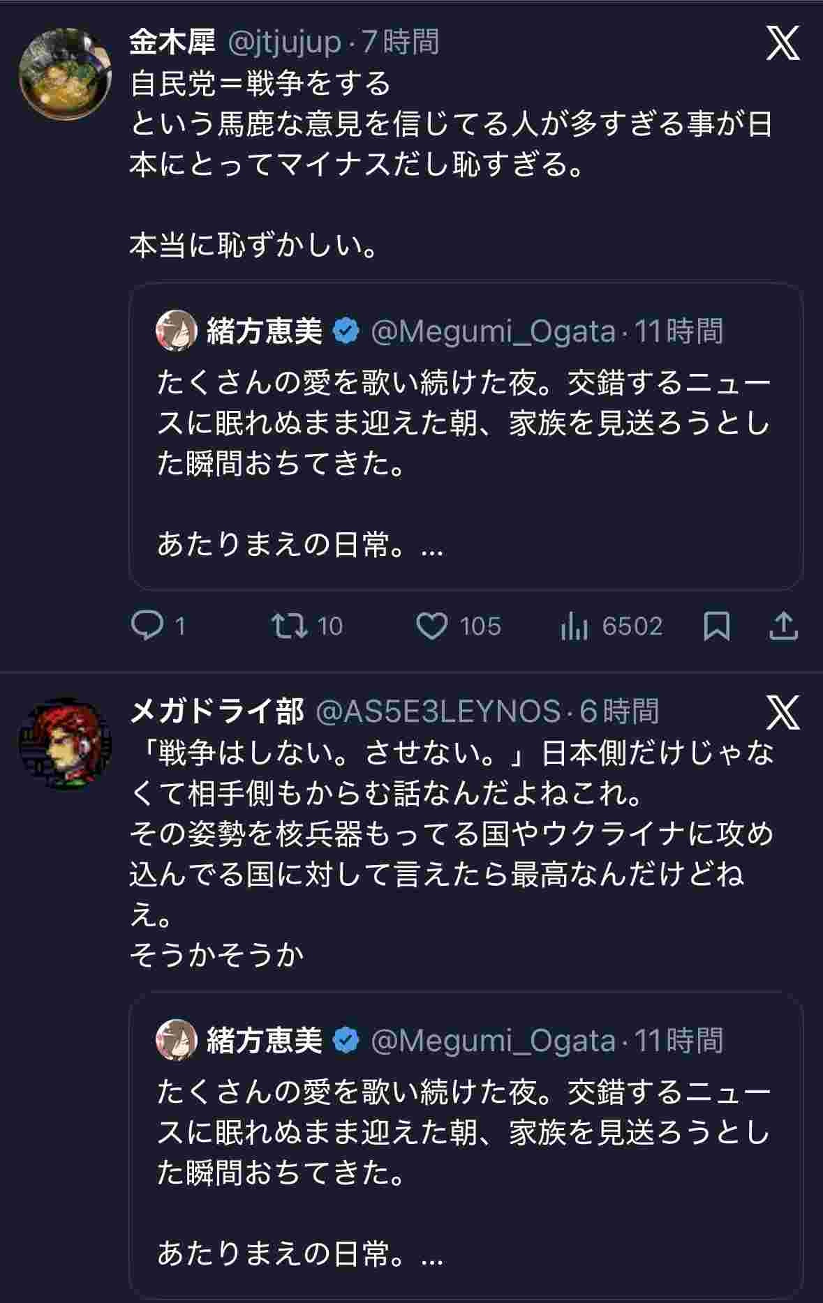 - 緒方恵美って割と右よりやった気がするんやけど高市NGなんか