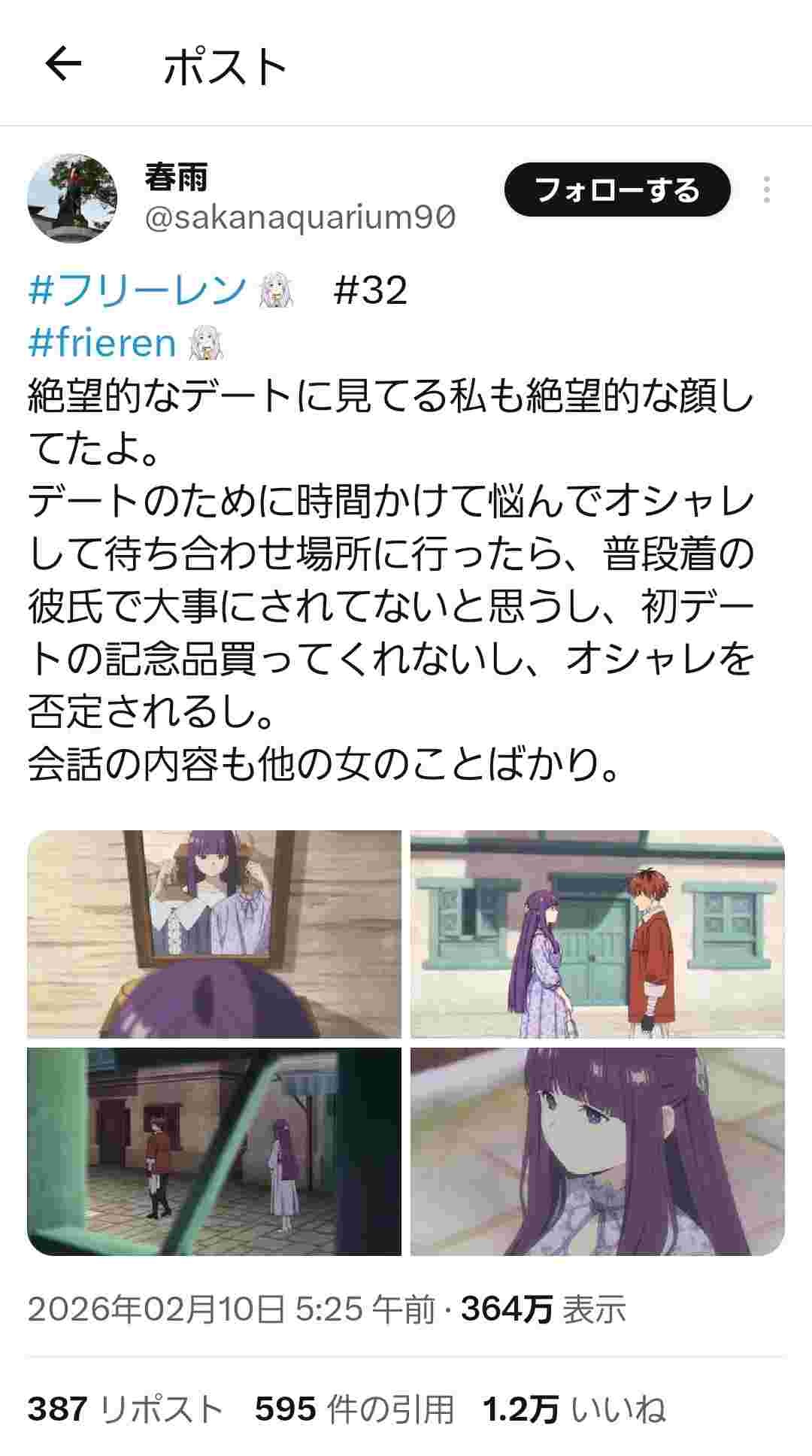 葬送のフリーレンのシュタルク、デートの態度が悪すぎて炎上