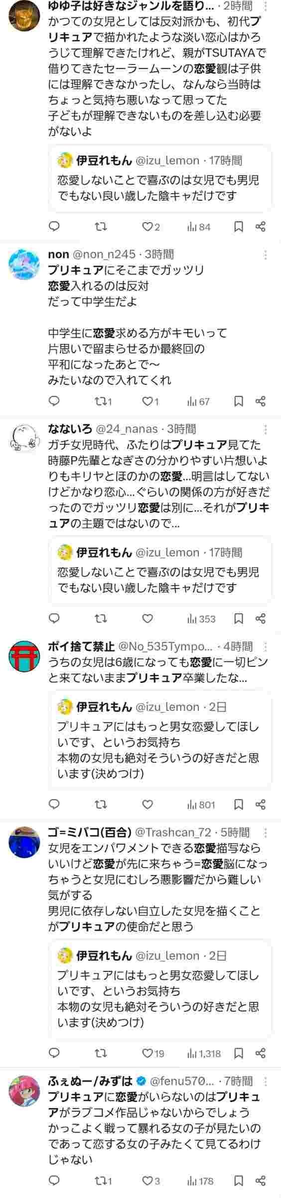 - そもそも子供は恋愛要素なんか望んでないだろって話もあるし子供が見たいのはカッコ良く活躍する女の子であって男とのイチャつきなんか求めているのかという