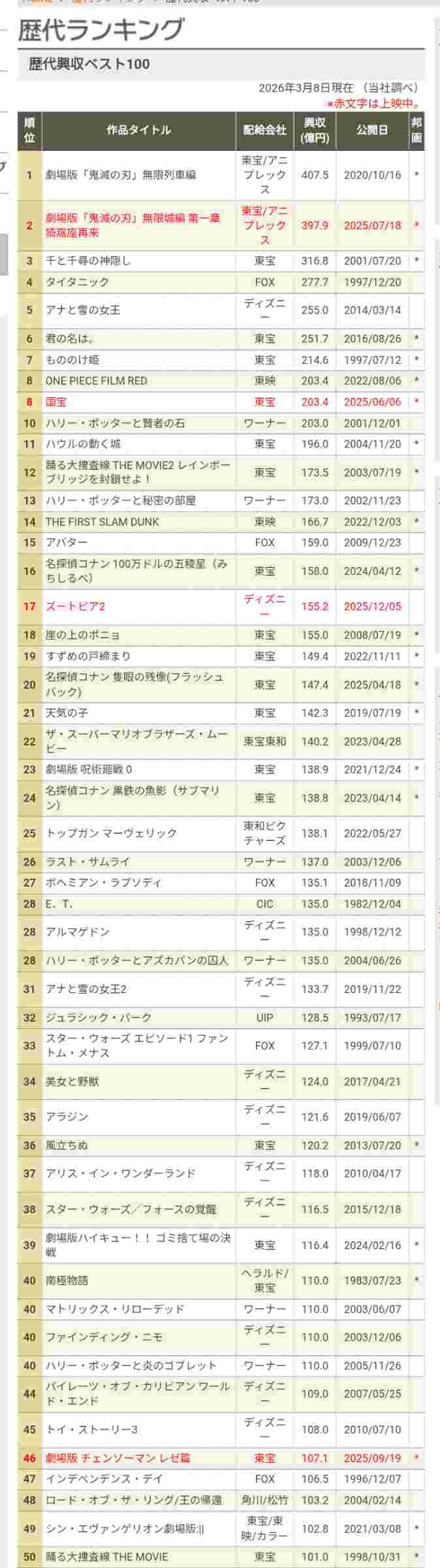 - 現在の興業収入ランキング