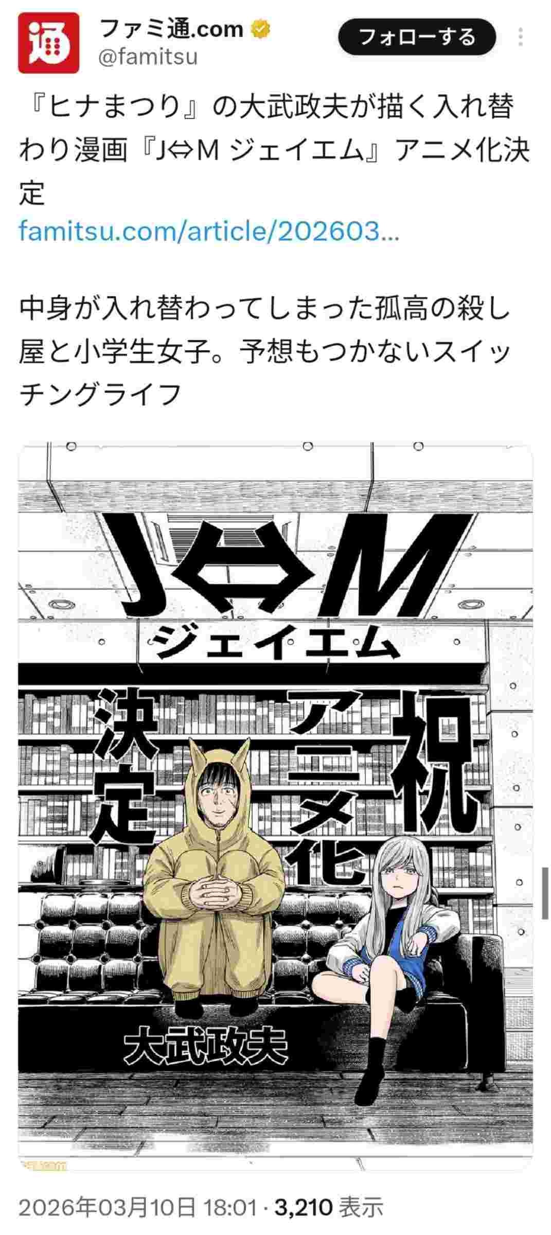 『ヒナまつり』の大武政夫が描く入れ替わり漫画『J⇔M ジェイエム』アニメ化決定