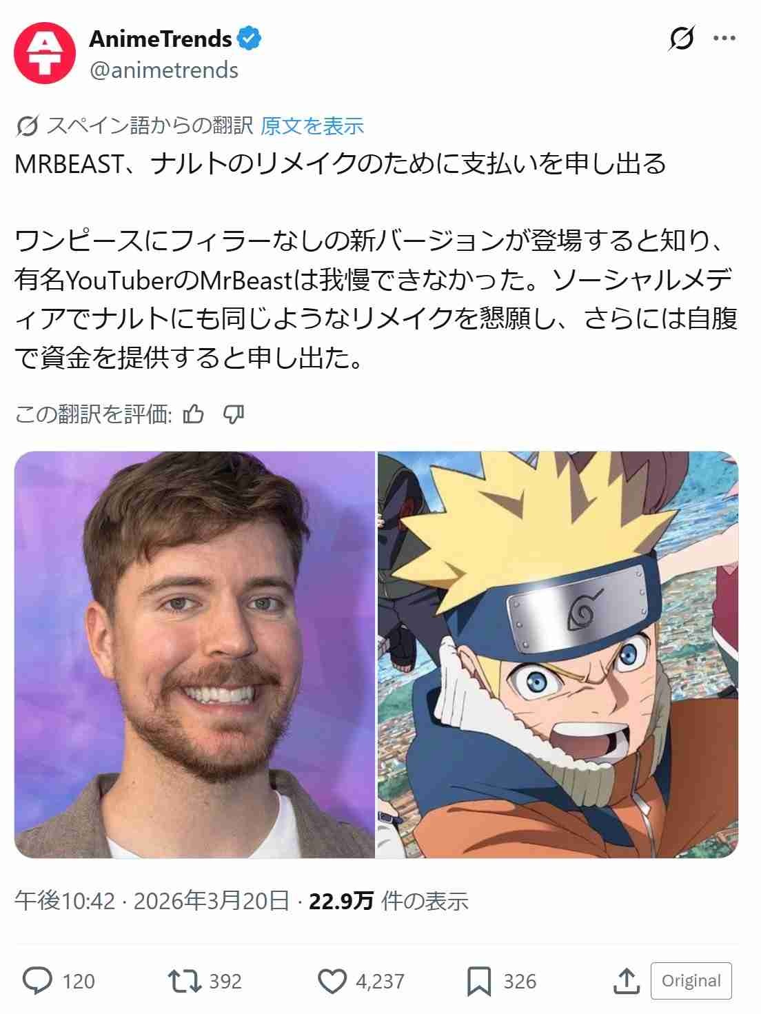 世界一のYouTuberのMrBeast、NARUTOリメイクに資金提供を発表する!!!