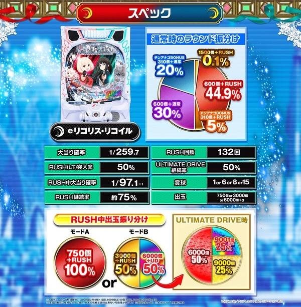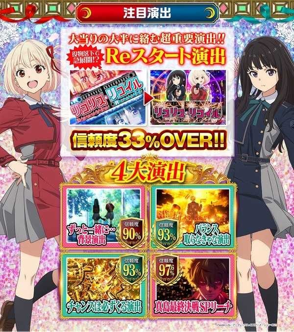 eリコリス・リコイル、公式サイトオープン!大当り確率1/259、LT突入50%&継続75%、6000個+α究極リコリコスペックで覇権確定www