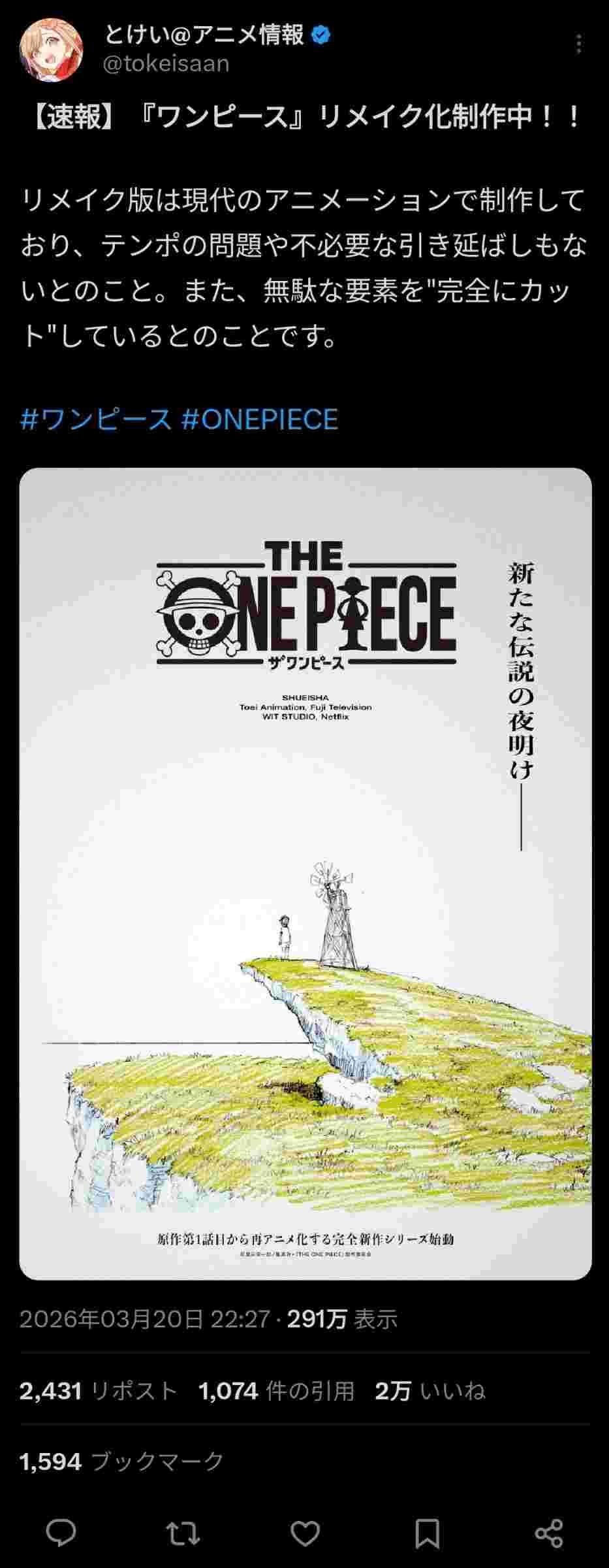 一挙視聴でも空島まではめっちゃ爆速なのにウォーターセブンから一気にペース落ちるからな - 33 : 2026/03/25(水) 17:47:57.458 ID:1oTRDzHqu
