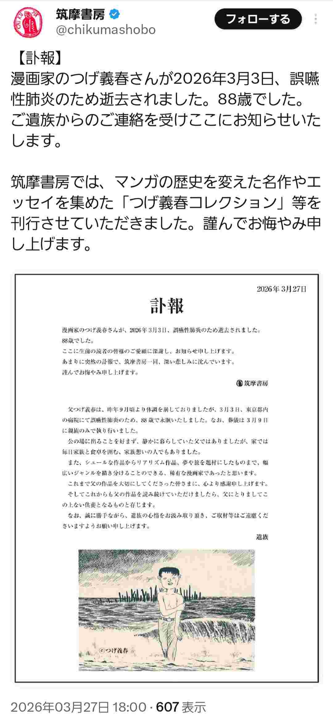 つげさんの作品の全集を出版する筑摩書房によりますと、つげさんは今月3日、誤えん性肺炎のため都内の病院で亡くなったということです。