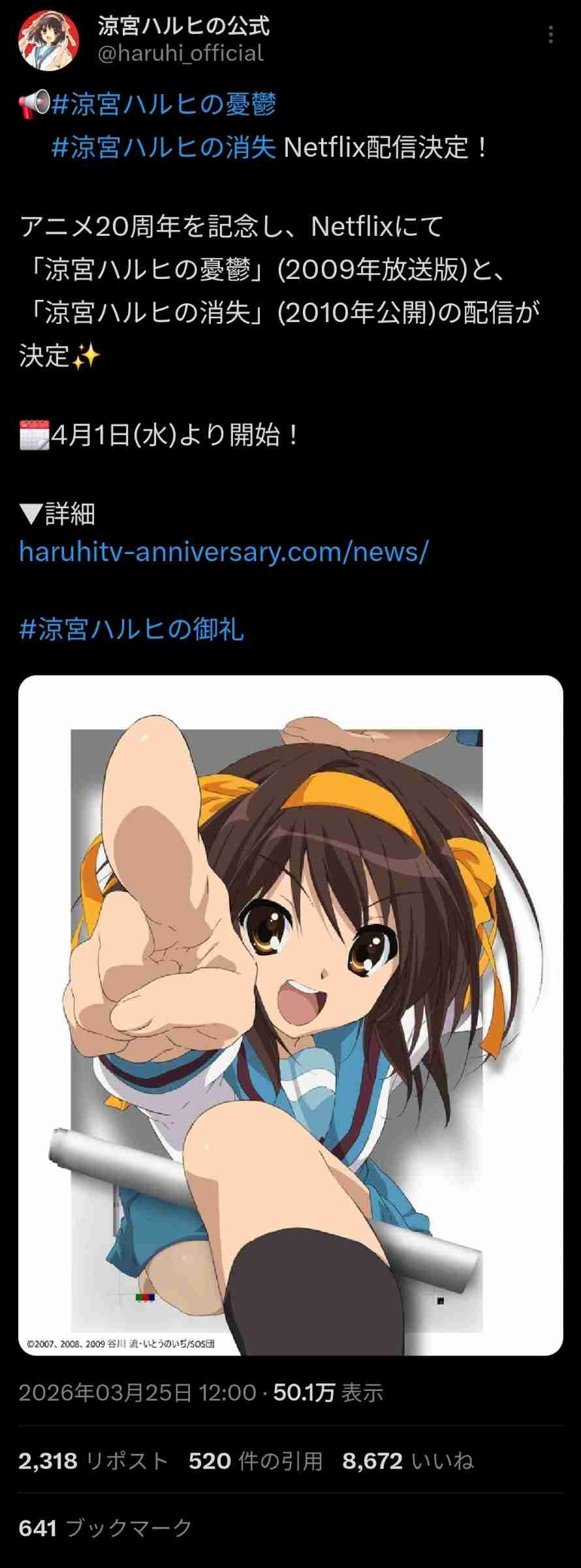 涼宮ハルヒの憂鬱、Netflixで配信決定www