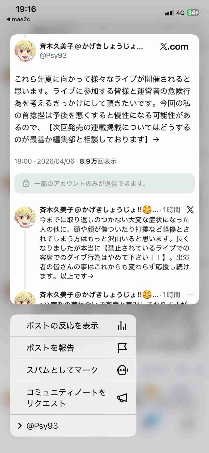 打ち切りは嘘だけど首捻挫して脳出血の疑いがあるのは本当だから君も漫画家さんのツイートrtしてくれや - 22 : 2026/04/06(月) 19:14:02.946 ID:FyiOWuRKw