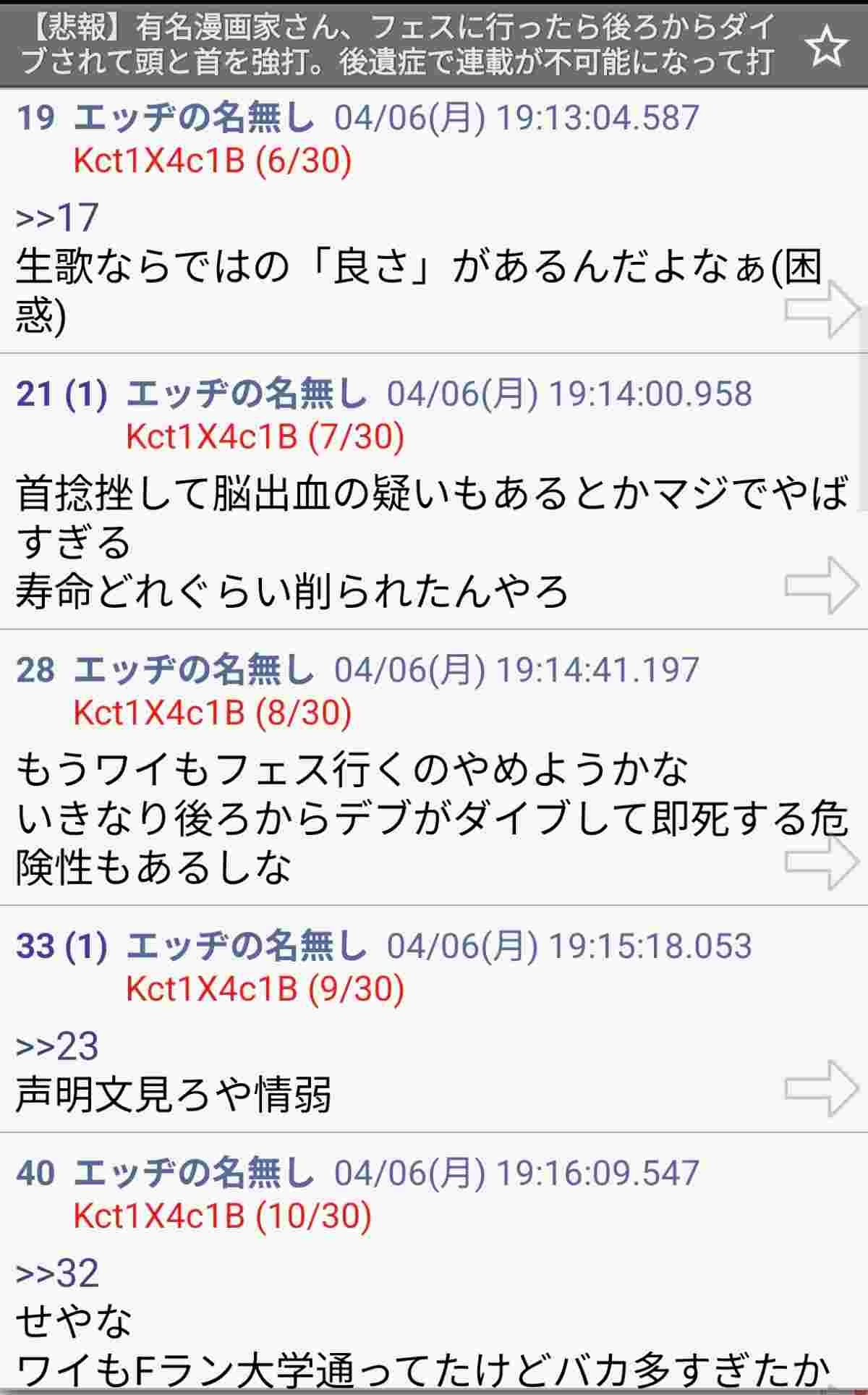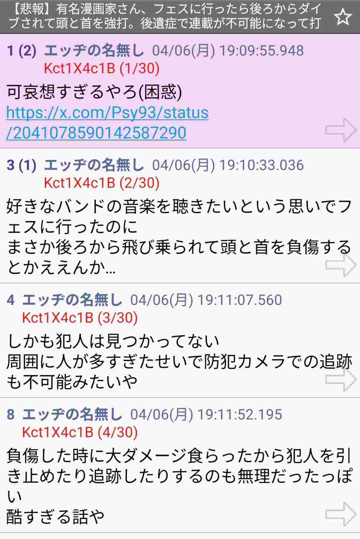 有名漫画家さん、フェスに行ったら後ろからダイブされて頭と首を強打。後遺症で連載が不可能になって打ち切りへwww