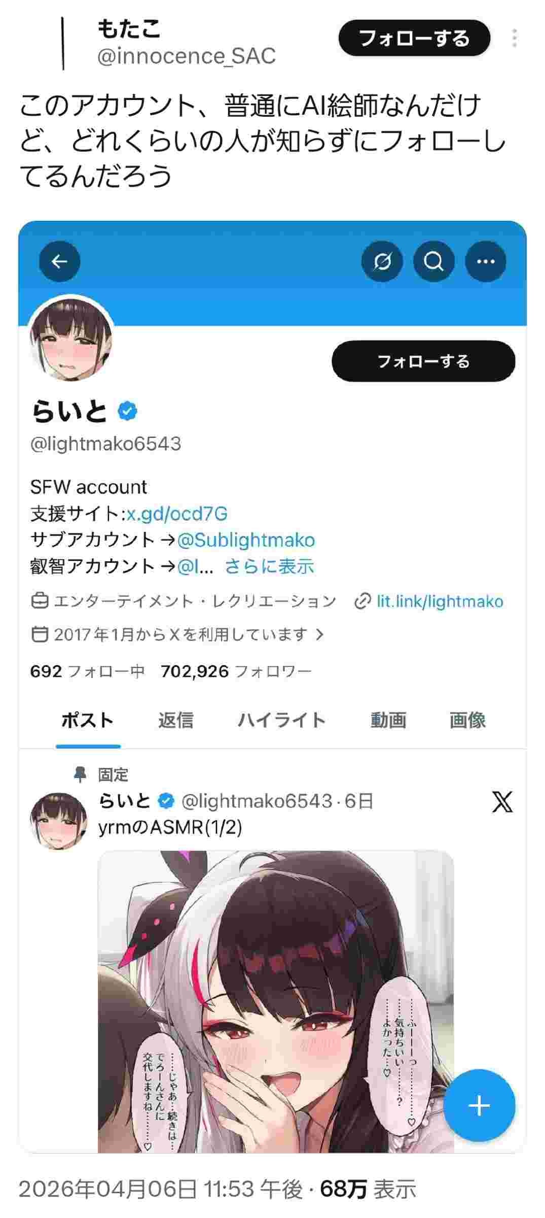 - AIでも70万フォロワーにいていいね押されまくるならええんちゃうの