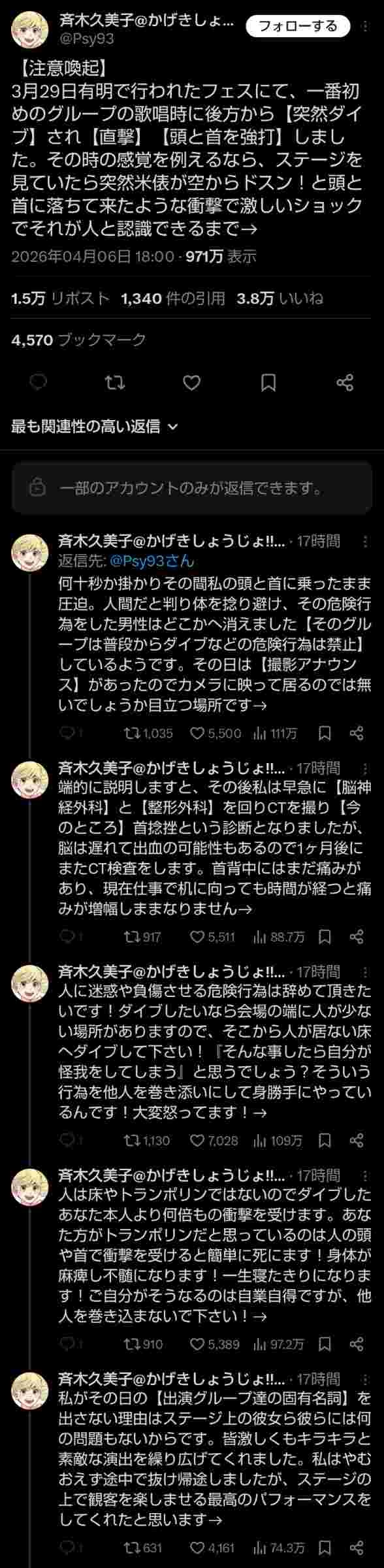 - ※文字数の兼ね合いで客席と表現しておりますが今回の場合はアリーナスタンディングです。事故後すぐに問題提起しなかったのはフェスの成功で盛り上がっているところへ水を差したくなかったからです。その思いは汲み取って頂けたらと思います。そして最後に現場で心配して下さった周りの観客の方々へ