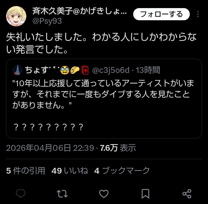 これいきものがかりでは10年間一度もダイブ起きてませんとか言いたいんかな - 94 : 2026/04/07(火) 12:07:37.271 ID:ZgruHh/9E