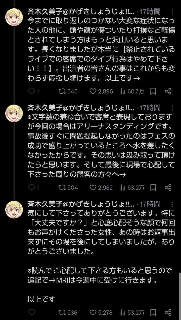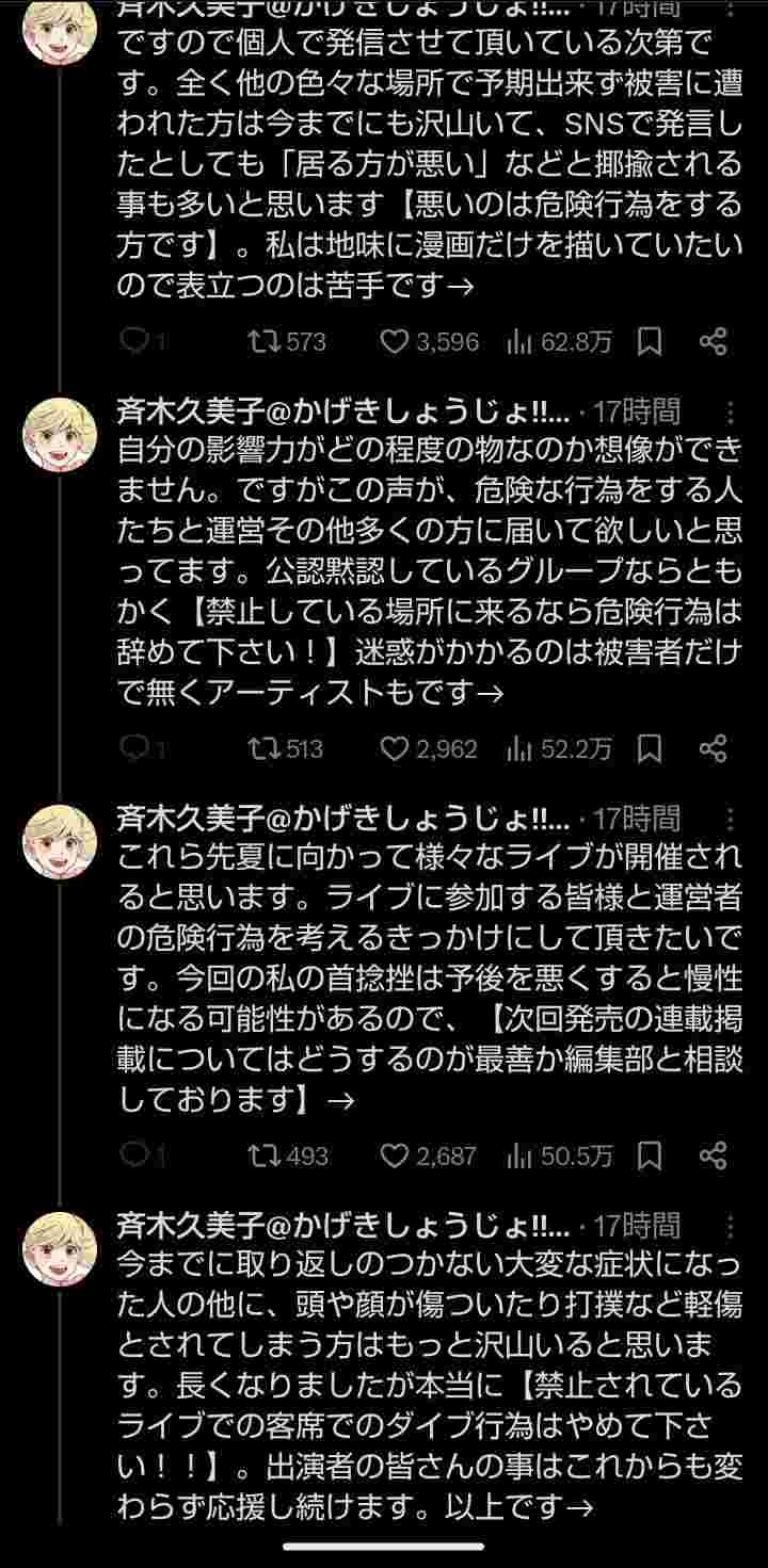 今までに取り返しのつかない大変な症状になった人の他に、頭や顔が傷ついたり打撲など軽傷とされてしまう方はもっと沢山いると思います。長くなりましたが本当に【禁止されているライブでの客席でのダイブ行為はやめて下さい!!】。出演者の皆さんの事はこれからも変わらず応援し続けます。以上です