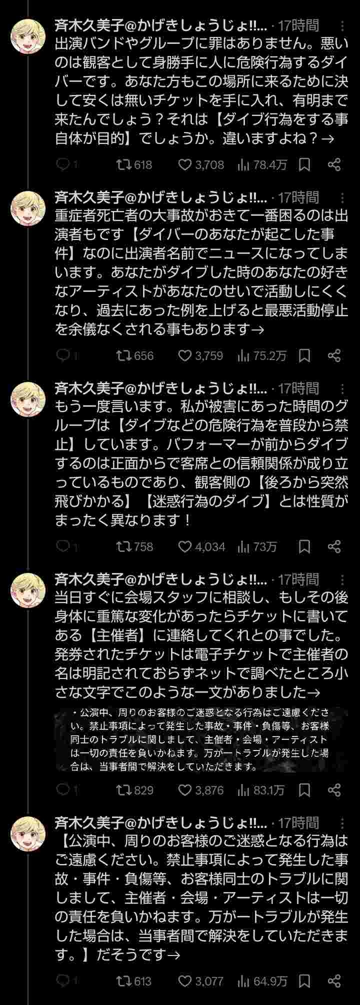 もう一度言います。私が被害にあった時間のグループは【ダイブなどの危険行為を普段から禁止】しています。パフォーマーが前からダイブするのは正面からで客席との信頼関係が成り立っているものであり、観客側の【後ろから突然飛びかかる】【迷惑行為のダイブ】とは性質がまったく異なります!