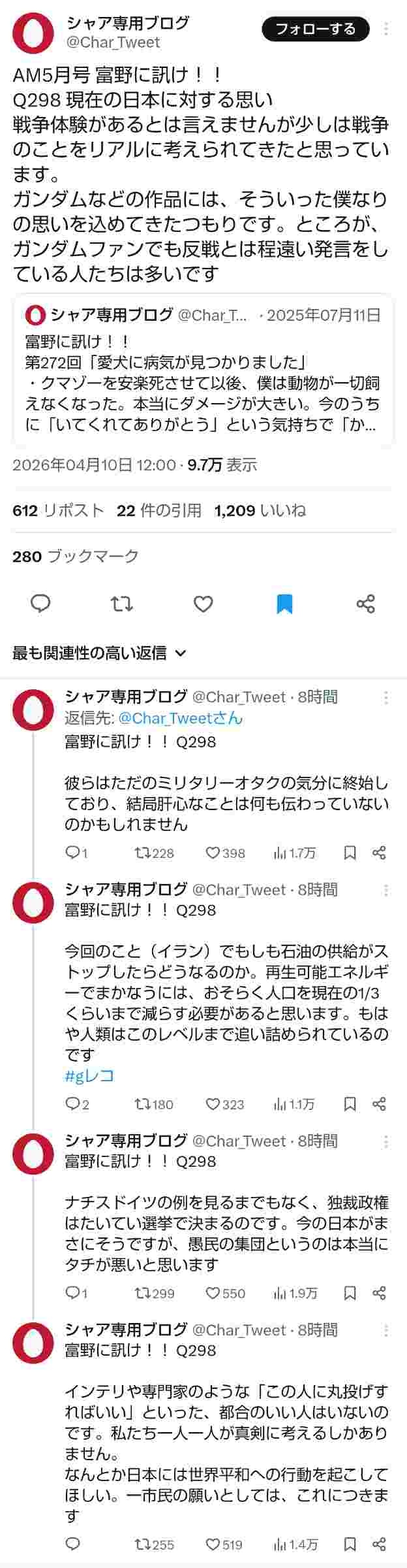 - 富野の反戦発言への反論としてガンダムの反戦要素は薄いと言い出すのが何も受け取れてない証拠やとワイは思う