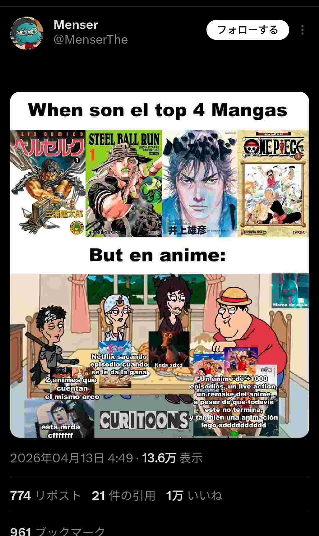 ベルセルク、ジョジョ7部、バガボンド、ワンピースらしい - 4 : 2026/04/15(水) 17:25:27.875 ID:uhfuEcTrq