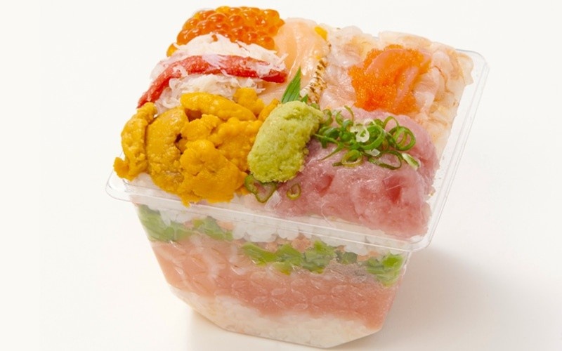 東京駅と直結している大丸東京店では、持ち帰りすし店「創作鮨処タキモト」のミルフィーユずしが好評だ。同店では15年以上前に、洋菓子のミルフィーユからヒントを得て、透明な四角いカップに酢飯とすしネタを重ねた「贅沢ミルフィーユ」を発売し、口コミで人気となった。
