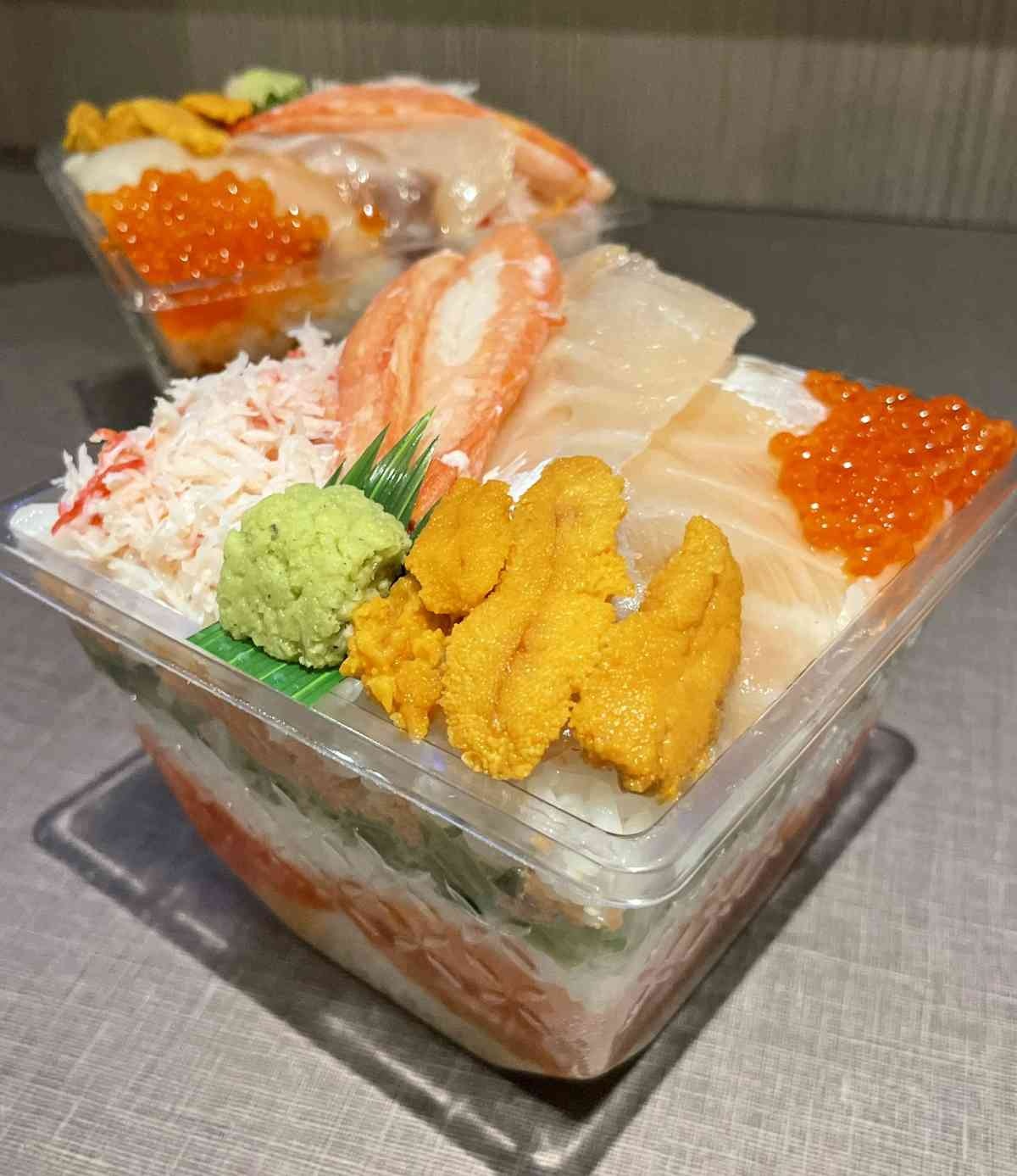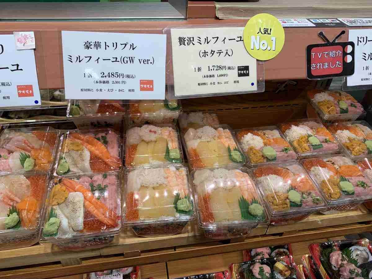 その後、5年ほど前に価格とご飯の量を抑えた「ドリームプリティミルフィーユ」を発売。上部にアワビやネギトロ、エビ、イクラ、カニが載せられ、その下には酢飯の層とサケフレーク、高菜、タラコ、キクラゲの佃煮などの層が重なっている。