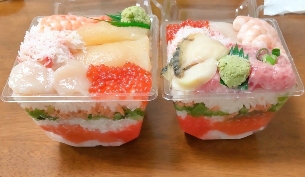 >上部にアワビやネギトロ、エビ、イクラ、カニが載せられ、その下には酢飯の層とサケフレーク、高菜、タラコ、キクラゲの佃煮などの層