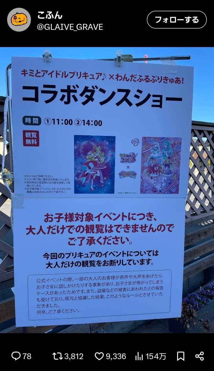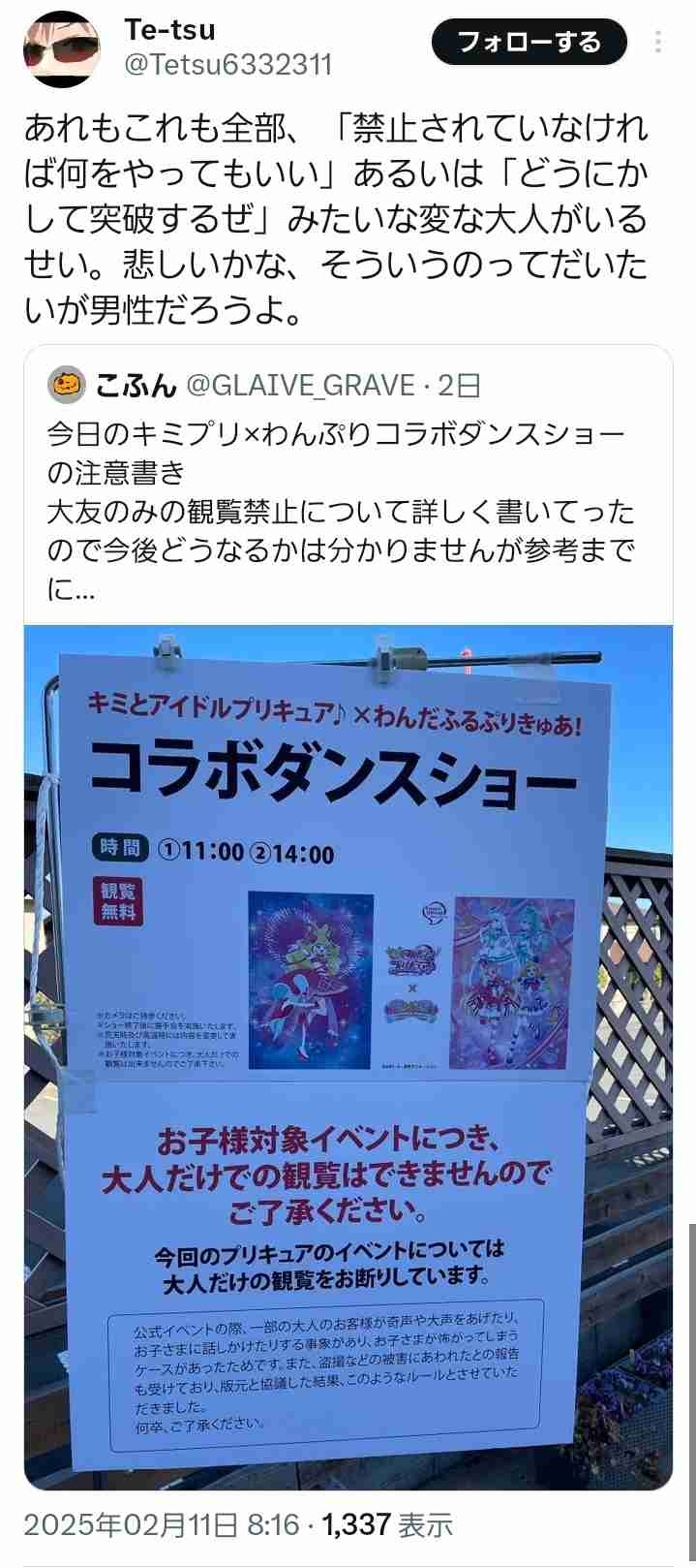 - いい年こいてプリキュアショー追っかけてるやつなんか男も女も等しく迫害されて然るべきカスなんだから禁止されてる時くらいは我慢しろ